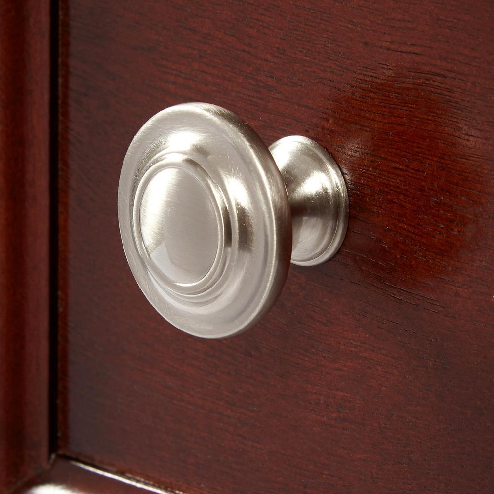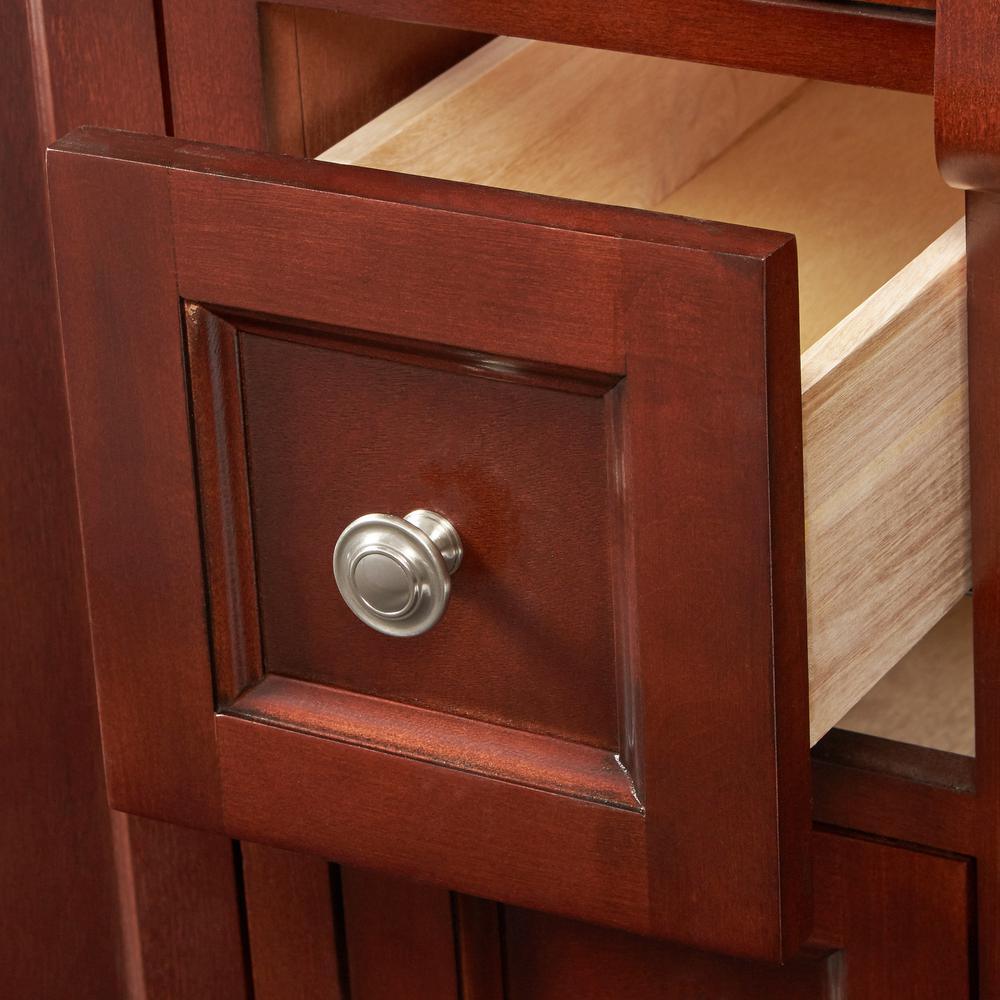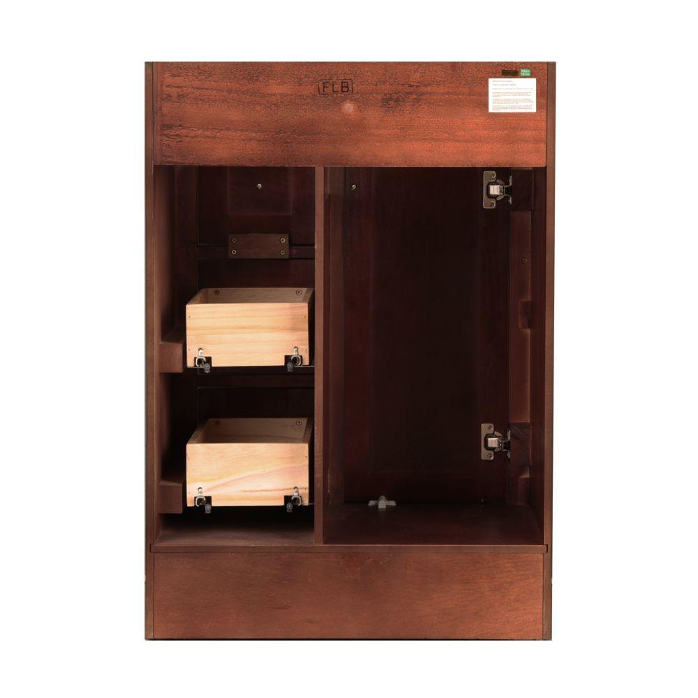 Awash with a warm tobacco finish, this 24 in. vanity cabinet sits flush with the floor and has a shallow 18 in. depth that is ideal for tight spaces. It is an attractive, stately piece with decorative accent boards that give it a splash of pizzazz. One left-side cabinet door and two right-side drawers are equipped with brushed nickel hardware, further enhancing its elegance. The solid, seamless construction gives homeowners and contractors the sense that it is custom-built, while the generous storage space within accepts bathroom accessories aplenty. Cap this dark brown furniture-style bathroom vanity with a top/sink/faucet combination that ties the room together. Browse the Foremost Naples lineup for a wall mirror in the same tobacco finish to augment your powder room makeover.