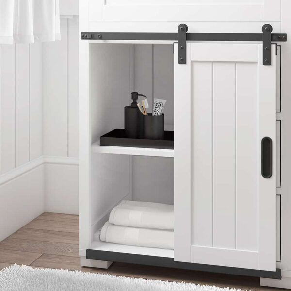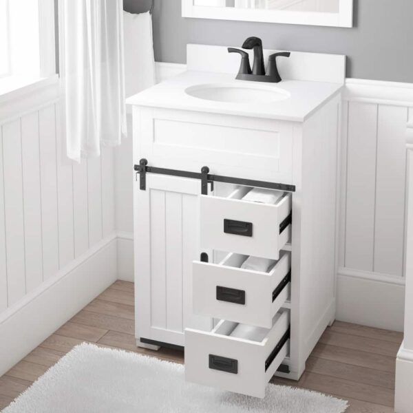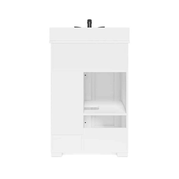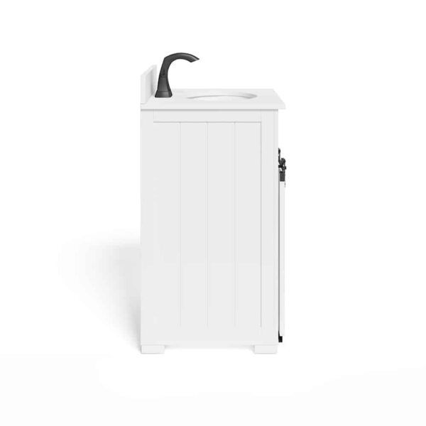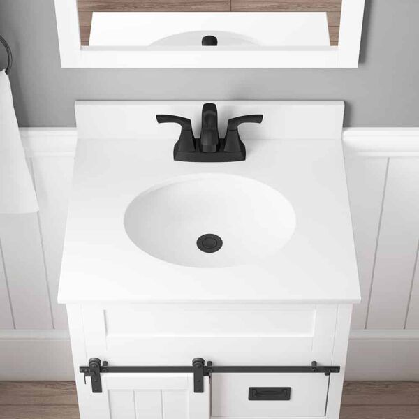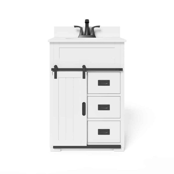 This white bathroom vanity is crafted with a single undermount sink and a white engineered stone top. Its 24-inch size makes it perfect for smaller bathrooms while providing ample storage space. With a sleek and modern design, it will elevate the look of any bathroom.
