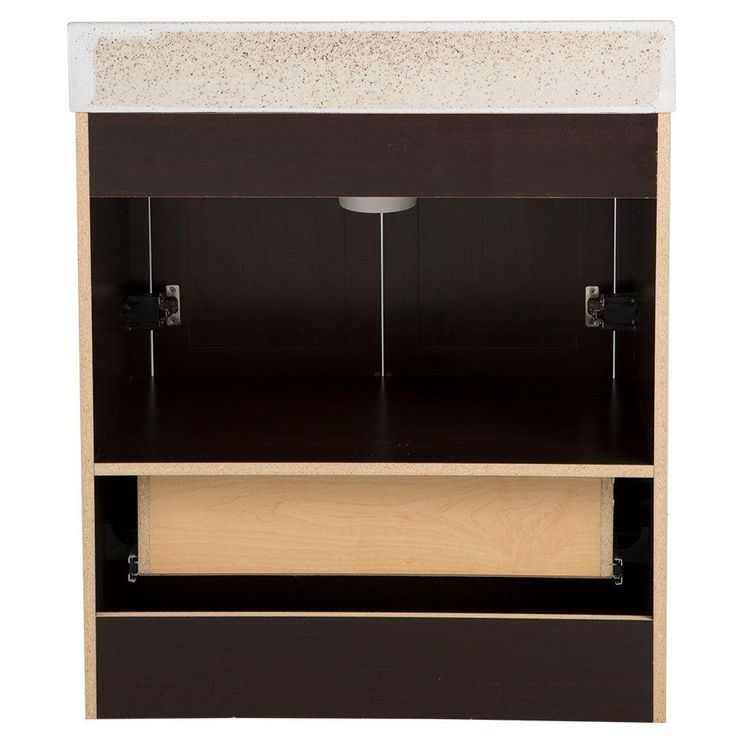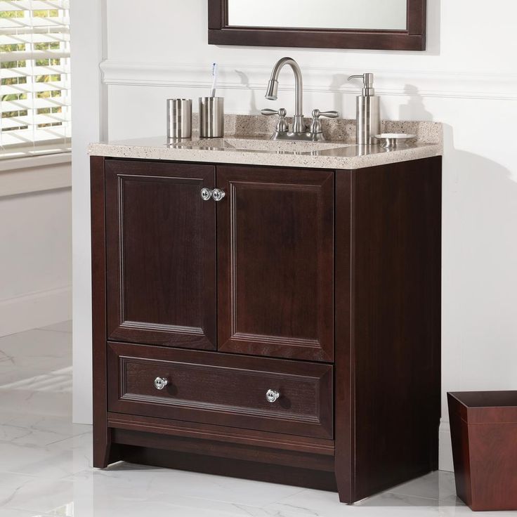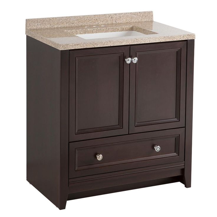 The Glacier Bay 30.50 in. Delridge vanity in Chocolate with a Solid Surface Technology Vanity Top in Caramel has a light beige vanity top base that is freckled with maroon, peach, and white elements that add a warmth and coziness your bathroom desires. Featuring a rich Chocolate finish, a large bottom drawer and polished chrome cabinet hardware, the Delridge cabinet ensures that your bathroom has a complete look that welcomes any guest with room for all of your bath essentials. Customize your home by using our additional modular items in order to create the perfect fit, making the Delridge Collection as beautiful as it is durable.