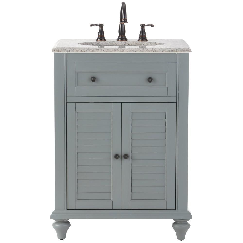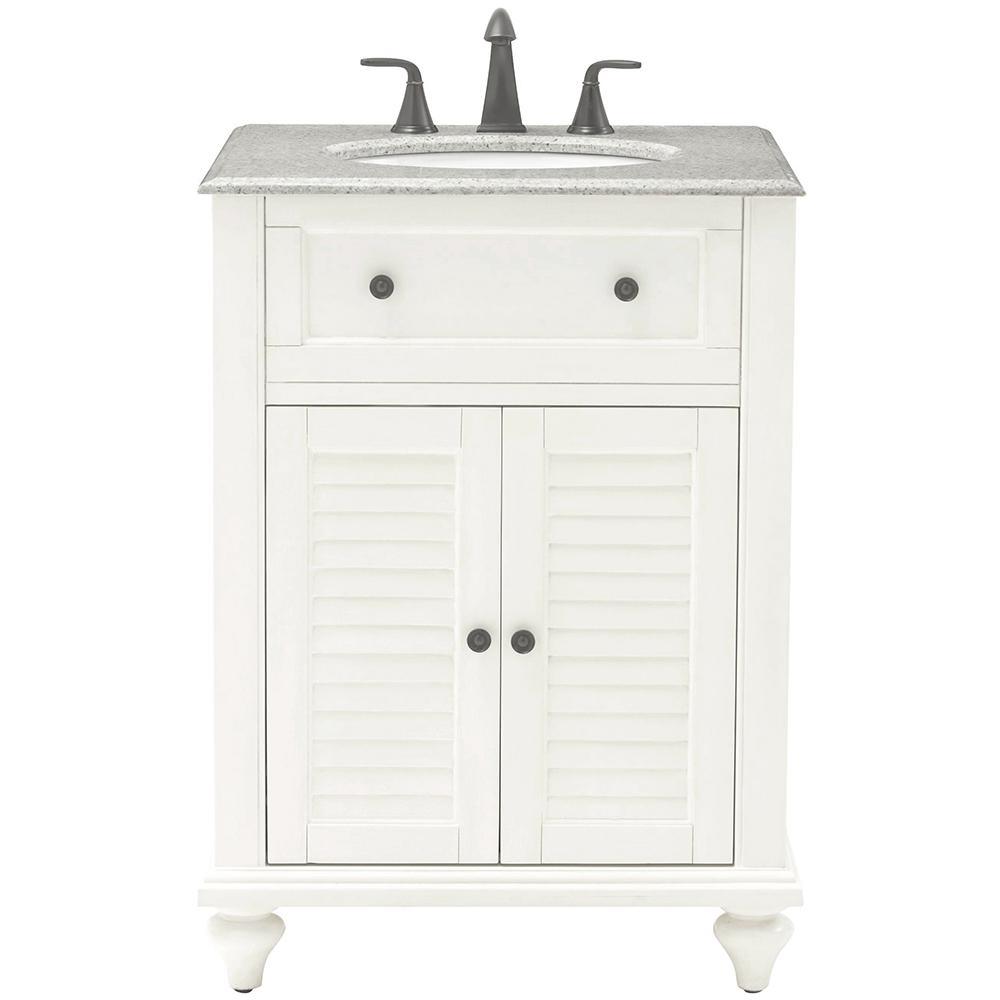 Perfect for a powder room or small bathroom, our Hamilton Shutter Vanity offers classic cottage charm. The faux drawer in front of the sink features an inset panel; the two soft-close doors boast louvered panels. Turned feet and a granite top complete the look. Crafted of real granite, the vanity top may contain swirling or veining. These features are part of the natural beauty of stone and have no effect on function or durability.