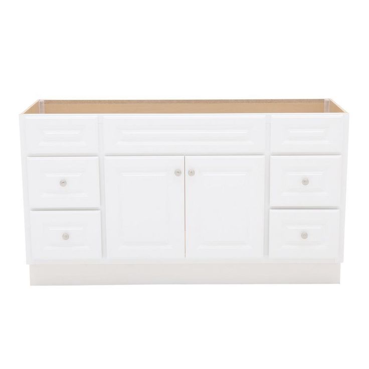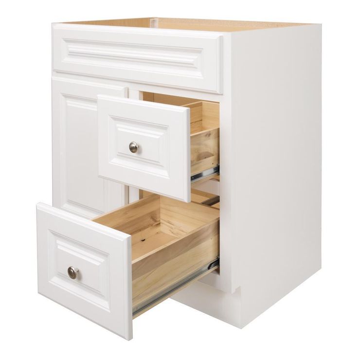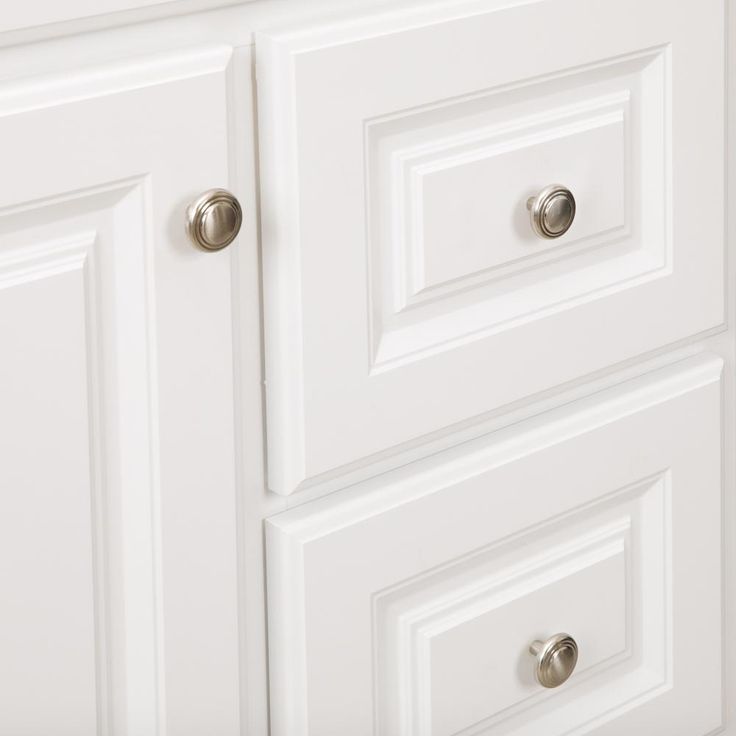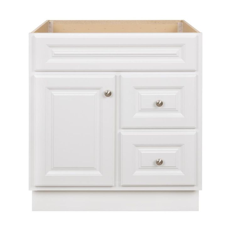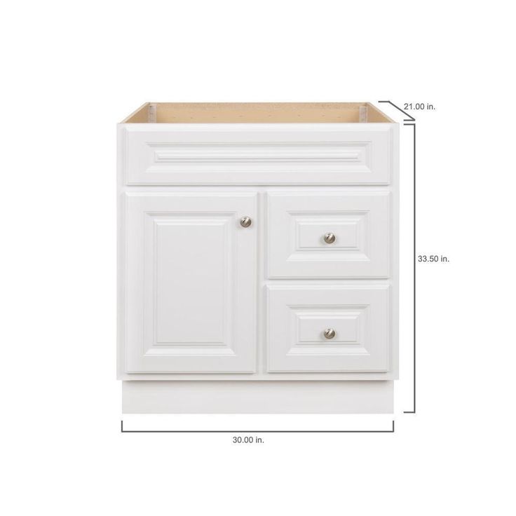 The Glacier Bay Hampton 30 in. W x 21 in. D x 33.5 in. H Vanity Cabinet Only in White is durably constructed with medium-density fiberboard (MDF) in a fresh white finish for a classic look that will complement many decor styles. Beautifully accented with nickel hardware, this stylish and functional vanity has plenty of storage space for toiletries and household items with 2-large drawers and a single cabinet all with an attractive maple interior that is easy to clean. Pre-assembled for easy installation, this vanity accommodates a vanity top with a single center set sink basin and will provide years of use and enjoyment. Limited Lifetime Warranty.