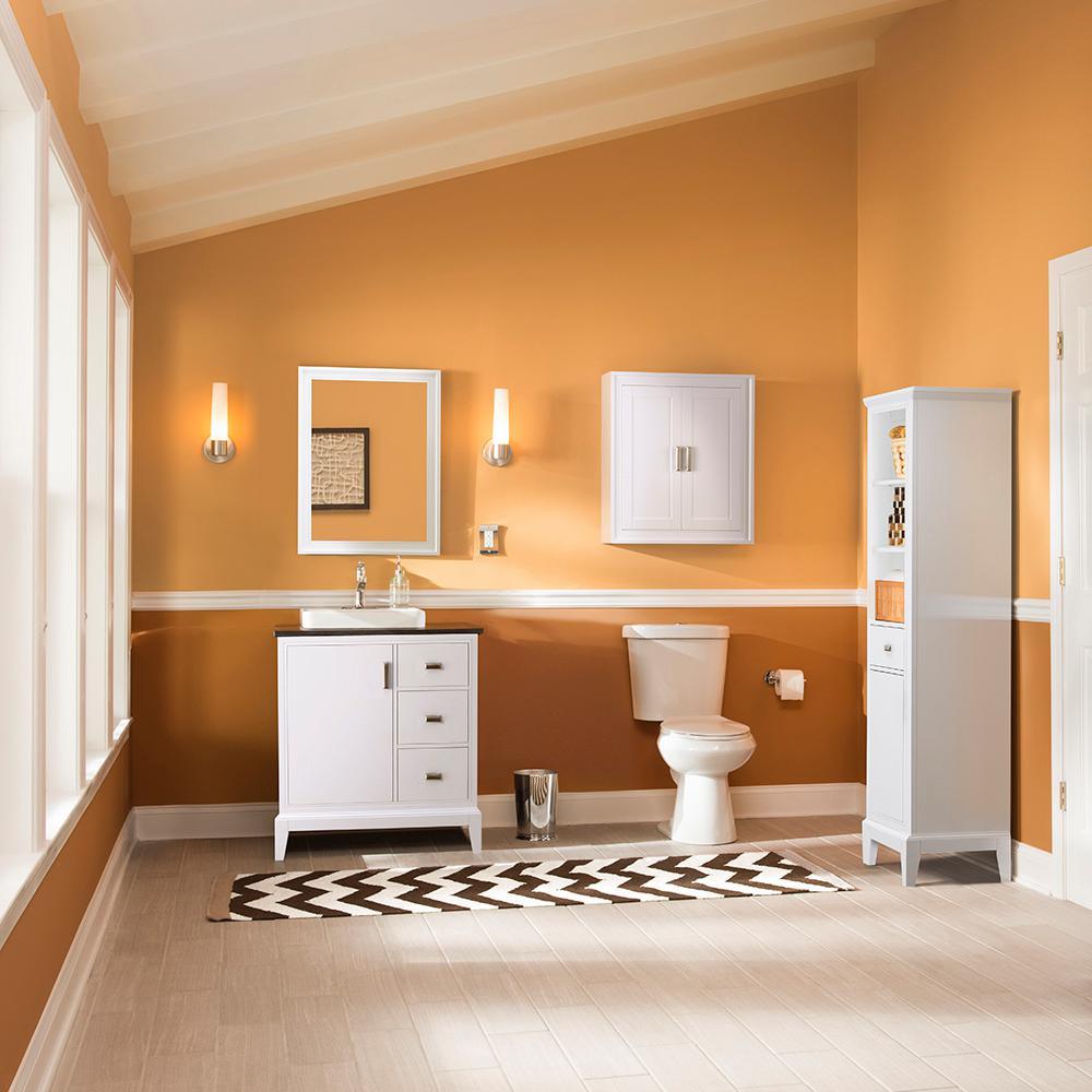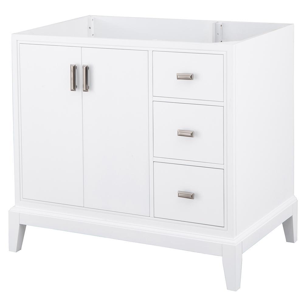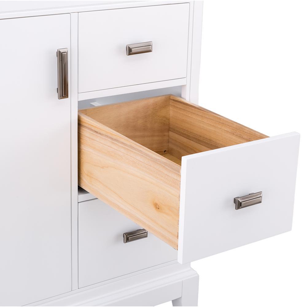 With its demure simplicity, the Shaelyn 31 in. vanity will bring a sense of style and sophistication to your bathroom. With a clean, crisp White finish, squared Brushed Pewter hardware and tapered legs accent the piece perfectly. One cabinet with an adjustable interior shelf and 2 full extension soft-closing drawers provide plenty of storage. Ideal on its own for a powder room or in a master bath accompanied by its matching storage pieces, the Shaelyn vanity is a winner for both style and quality.