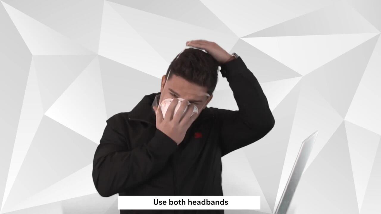 A: It uses two non-latex TPE headbands with welded attachments; fit is adjusted via the nose clip and proper donning.