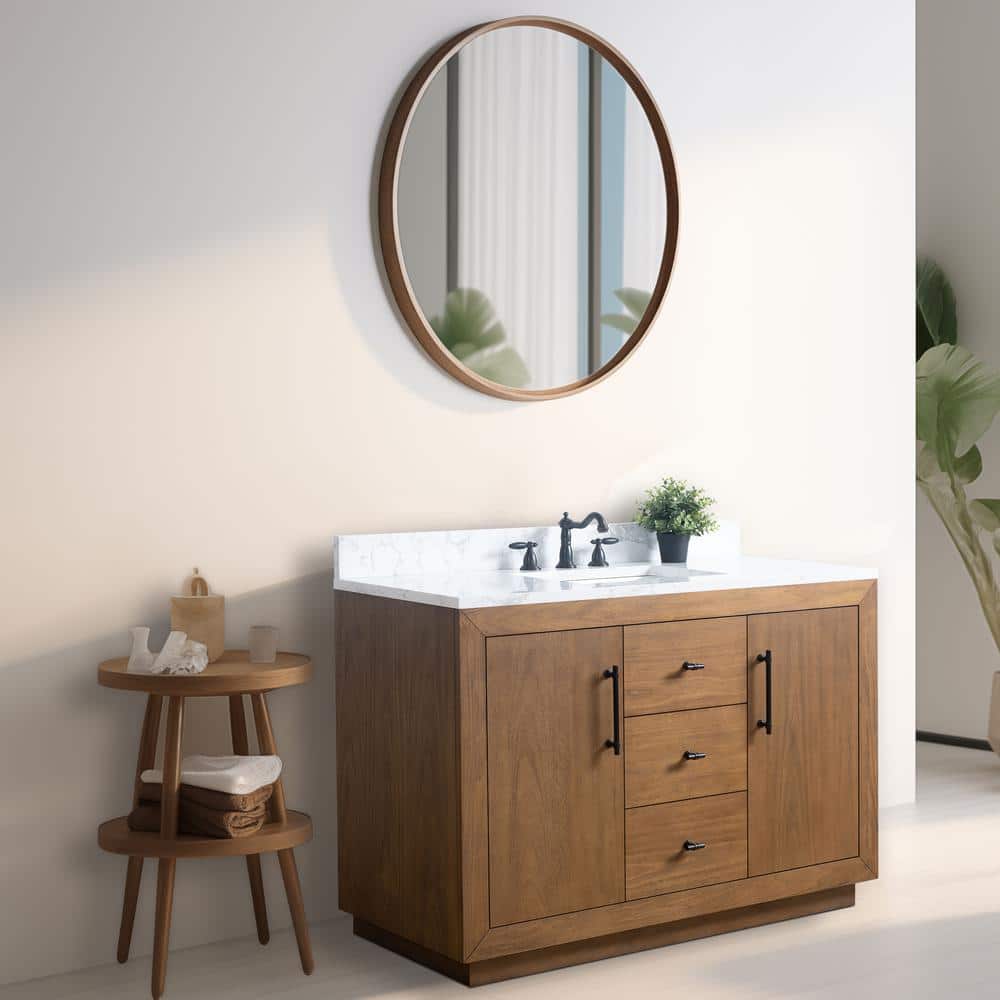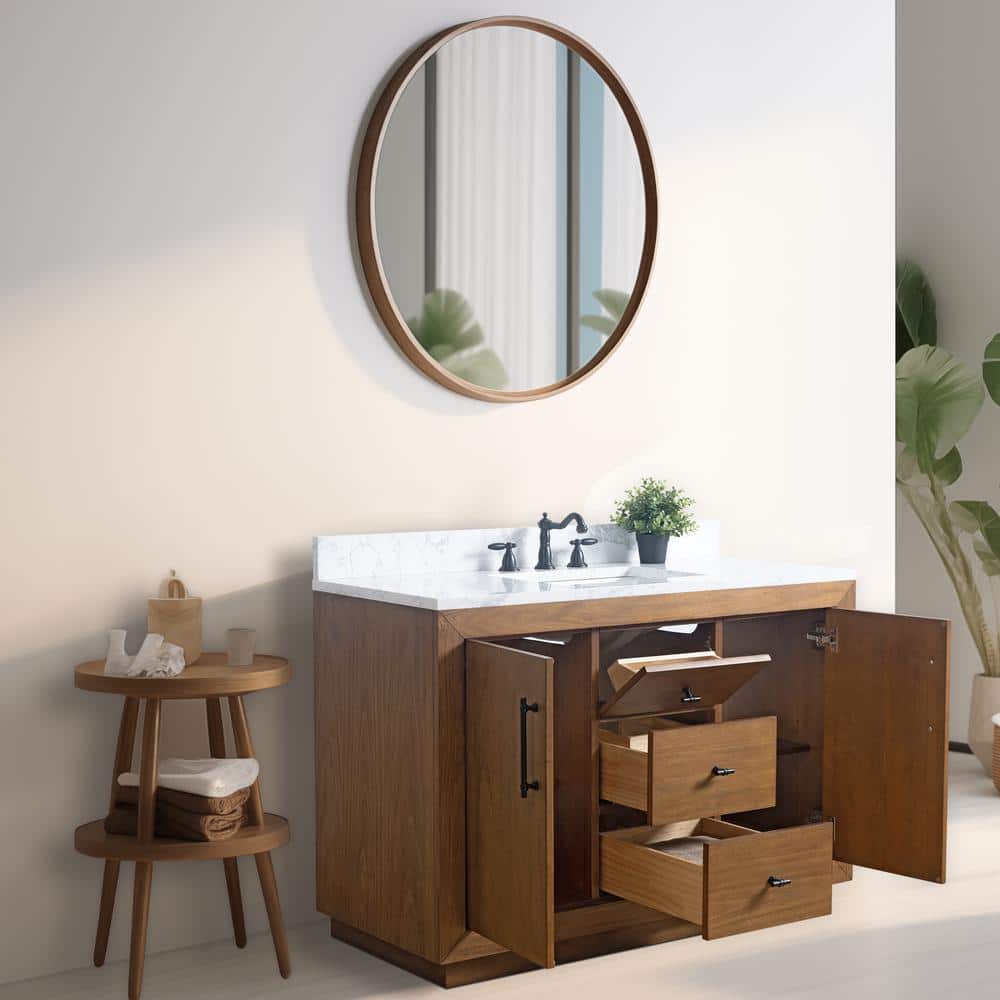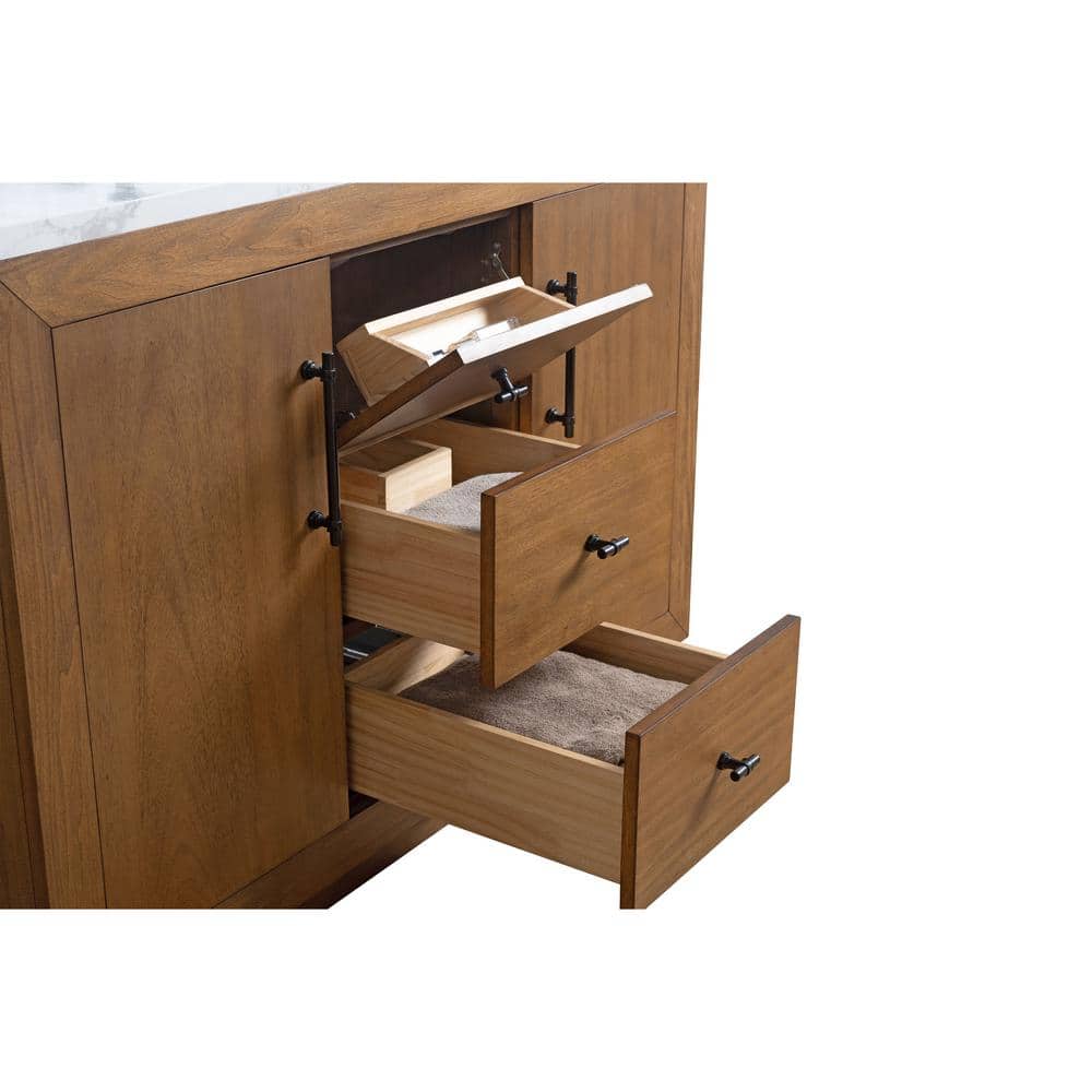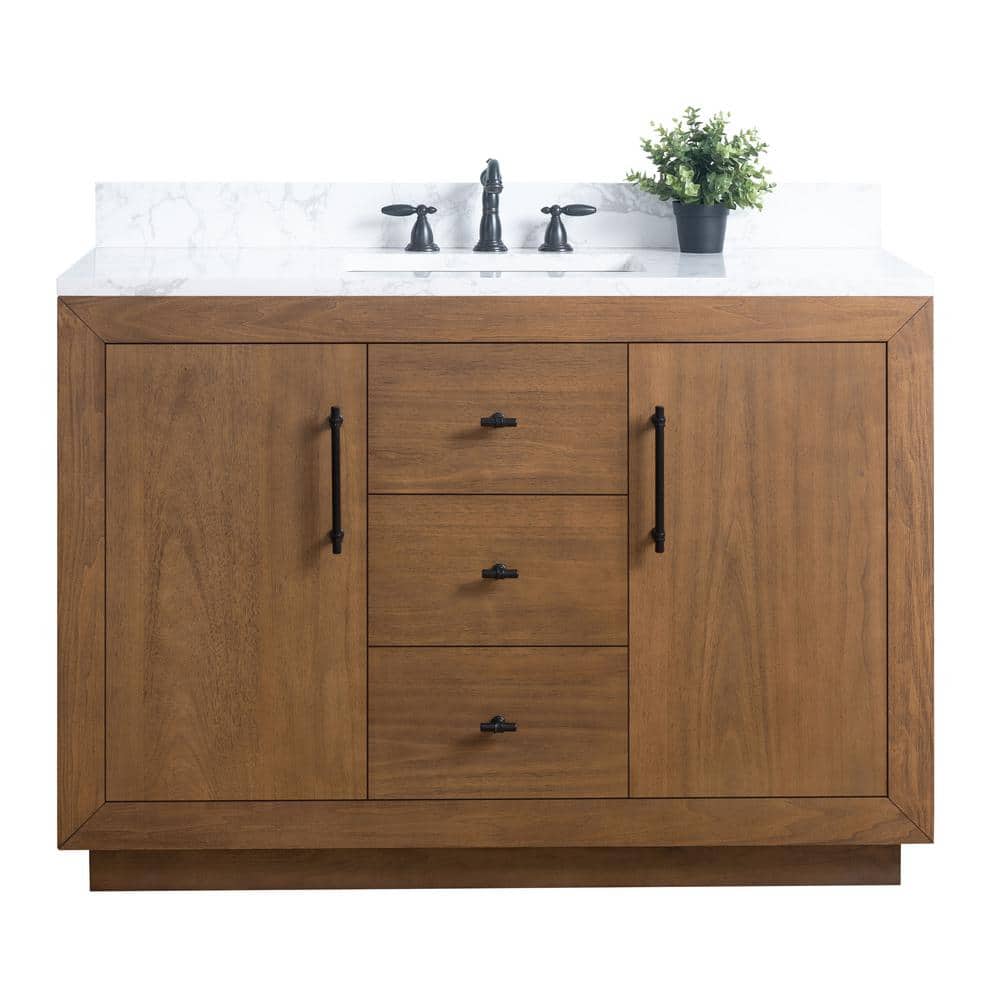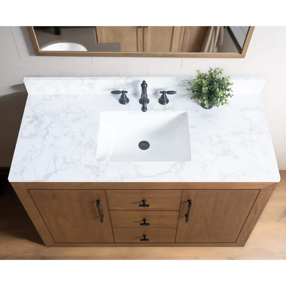 A freestanding 48-inch bathroom vanity crafted by Vanity Art, featuring a tan cabinet with solid poplar frame and MDF base for durability. Topped with an Arabescato white engineered marble countertop and an undermount rectangular ceramic sink, it arrives fully assembled with matte black hardware and included backsplash.