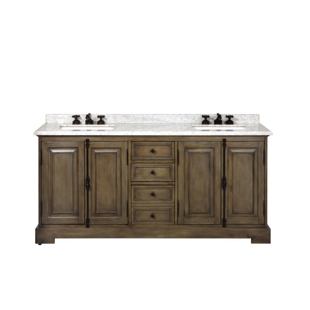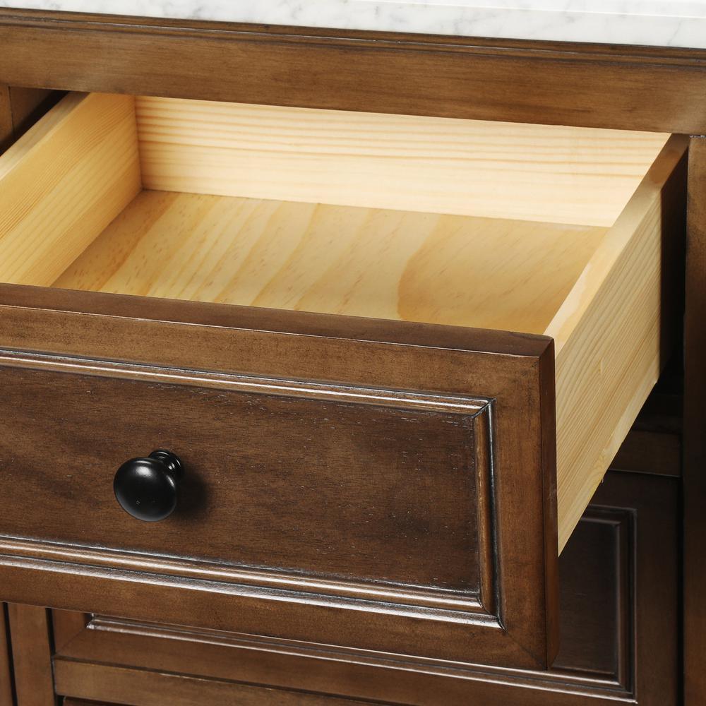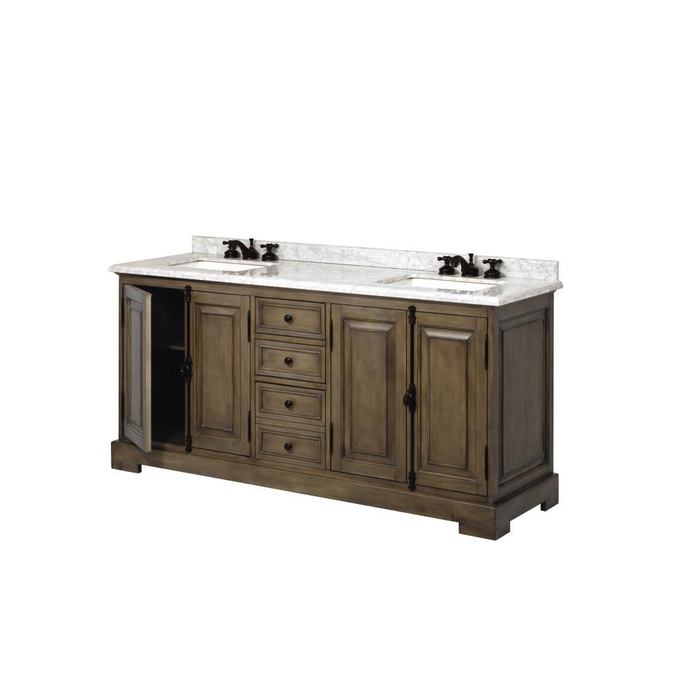 Add a transitional look to your bathroom with the traditional style and modern lines of this 72 in. Clinton double vanity. Its angles form a shallowly stepped pedestal base with block-style feet that give way to a perfectly straight toe kick. The unique double sink features real Italian Carrara marble, which may contain swirling or veining that accentuates the beauty of the natural stone. The vanity’s classic raised panel doors and drawers are highlighted by elegant iron hardware. The vanity top is pre-drilled for two three-hole faucets with an 8-in. spread. The faucets are sold separately. It is fully assembled for your convenience.