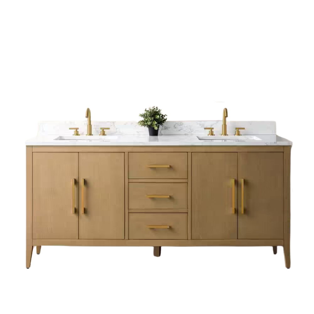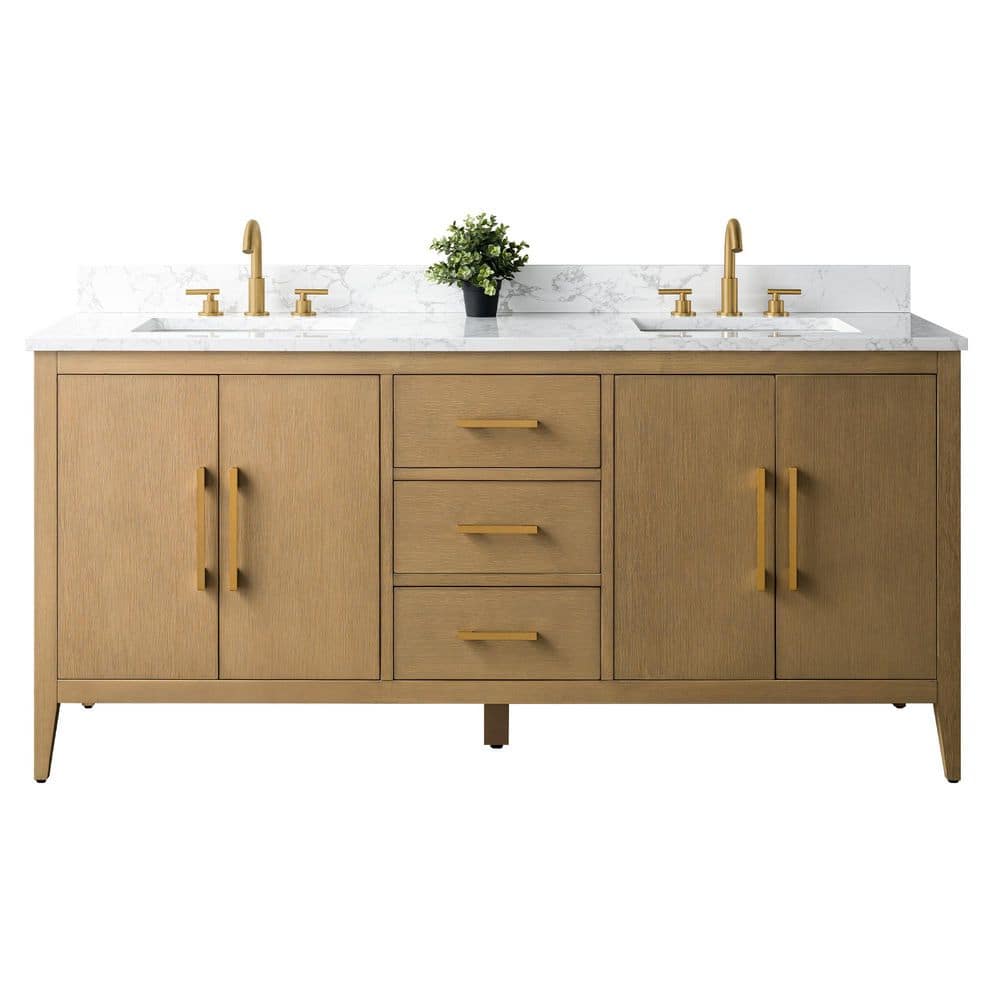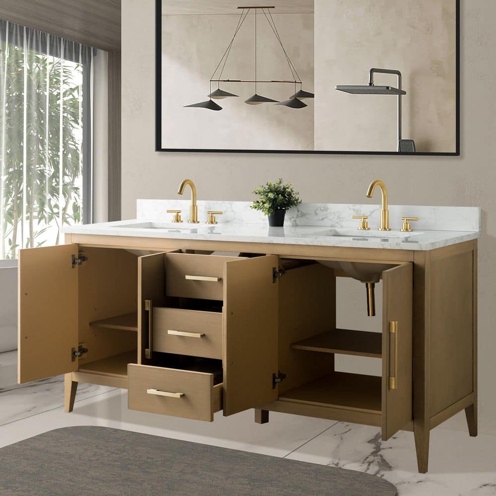 Elevate your bathroom's style and functionality with the Vanity Art 72-inch Double-Sink Bathroom Vanity. This elegant piece combines natural oak craftsmanship with a luxurious Arabescato White engineered marble top, making it a standout addition to any bathroom. Designed to deliver both style and practicality, this vanity offers generous storage space and a spacious countertop, ideal for busy households or master bathrooms.