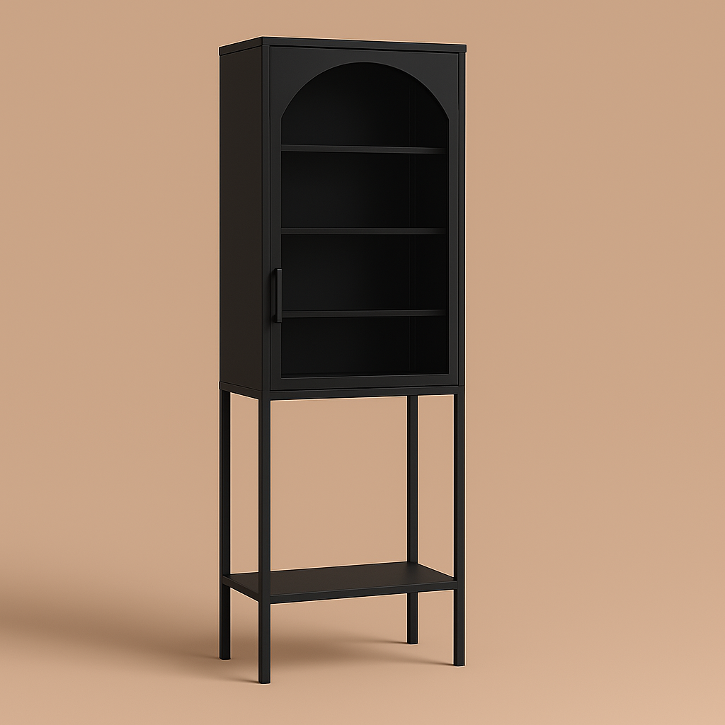 The FUNKOL Black Metal Storage Cabinet is a masterpiece of modern design, blending sleek aesthetics with practical utility. Its arched glass doors and minimalist black finish create a striking focal point, while adjustable shelves offer versatile storage solutions. Style it in a living room to showcase curated decor or in an office for organized sophistication. This cabinet is not just furniture; it's a statement of refined taste and functional luxury.
