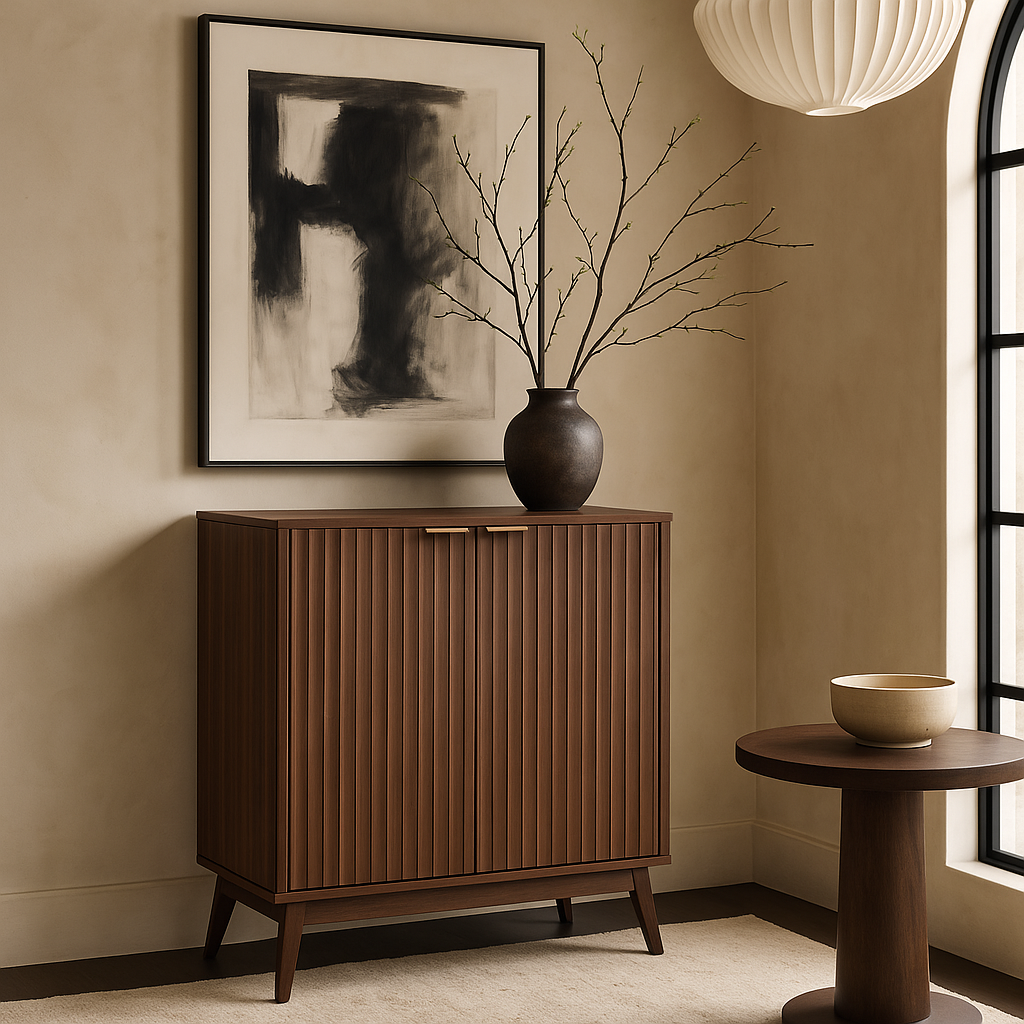 - Stylish Design: Features wood grain fluted panels and brass handles.