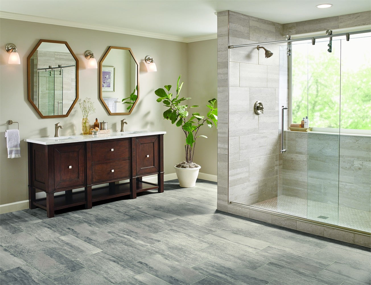 This sheet vinyl evokes the nuanced striations of weathered stone, lending bathrooms and kitchens a serene, spa-like poise. The low-gloss finish softens light beautifully while the subtle grout lines create architecture underfoot. Pair it with brushed nickel hardware and warm walnut cabinetry to balance its cool Shale Gray palette. It’s an effortless route to luxe living—high style with everyday practicality.