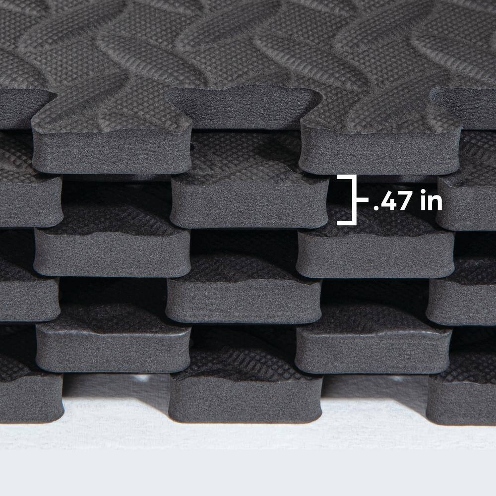 A: Each tile is 0.47 in. (12 mm) thick for balanced comfort and durability.