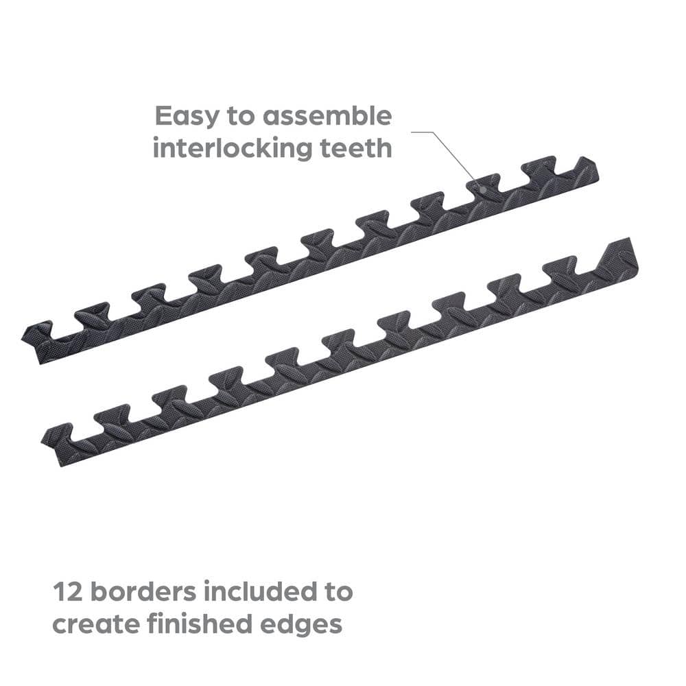 A: Six 24 in. x 24 in. tiles cover 24 sq. ft., and 12 straight-edge borders are included for finished edges.