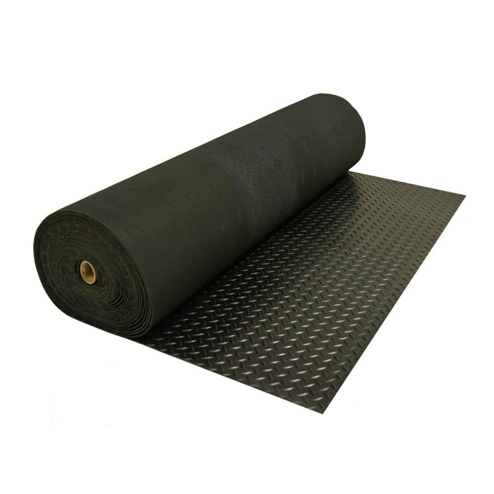 A durable, non-slip synthetic rubber mat with classic diamond-plate texture, ideal for protecting floors and equipment. This 4 ft. x 4 ft. sheet installs easily and withstands harsh, high-traffic applications in gyms, garages, and utility areas.