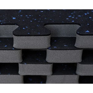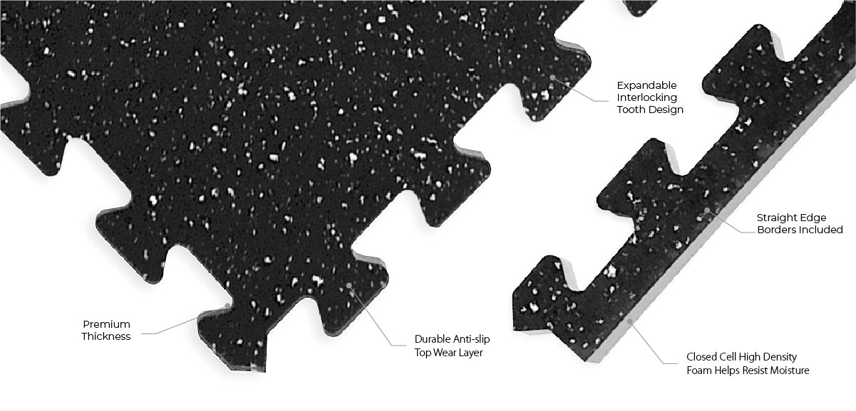 These interlocking tiles bring a sophisticated, speckled graphite surface that instantly refines a workout space. The premium wear layer reads modern and tailored, while the cushioned core softens sound and impact for a serene, high-performance environment. Style them wall-to-wall or create a defined training zone with the straight-edge borders for a gallery-like polish. A chic essential that marries durability with elevated design for everyday luxury.