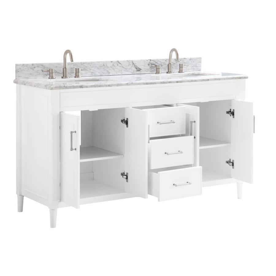 61W x 22D x 34.8H inches 4 soft-close doors and 3 soft-close drawers Adjustable height levelers Solid rubber wood, MDF and plywood Brushed nickel finish hardware White finish Top pre-drilled for 8 in. widespread faucet; facuet not included Dual white vitreous china rectangular undermount sinks 1.5 in. Carrera white marble top with laminated edge and backsplash