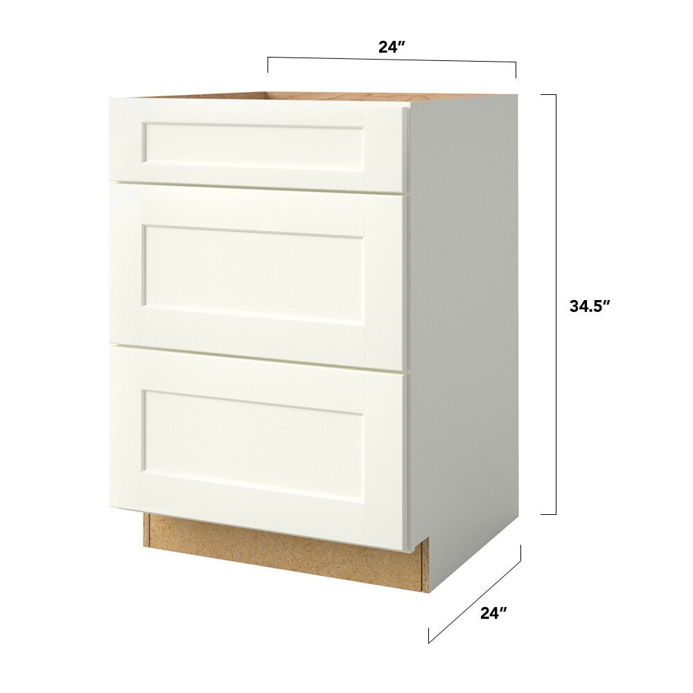 The Aveley Linen 3-Drawer Base Cabinet effortlessly transforms any kitchen into a serene, elegant space with its crisp, bright white finish and seamless lines. The standout feature—a high-quality soft-close mechanism—ensures both functionality and tranquility. Style it with sleek, modern hardware and lush wooden countertops to create a harmonious blend of classic and contemporary design. Embrace the Aveley cabinet as a cornerstone of refined living, providing storage solutions that marry practicality with luxurious aesthetic appeal.