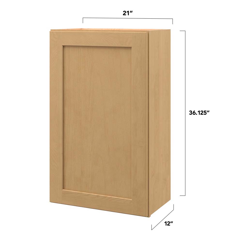 The allen + roth Innsbrook Rye Wall Cabinet combines timeless Shaker design with modern functionality. This fully assembled unit features a warm light stain and soft-close doors, offering both aesthetic appeal and practical convenience for any kitchen or workspace.