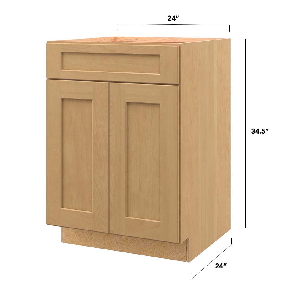 The allen + roth Innsbrook Sink Base Cabinet offers an elegant Shaker style with a warm rye finish, perfect for blending with modern and classic interiors. This fully assembled cabinet is crafted for durability, featuring soft-close doors that ensure quiet and effortless use in any busy kitchen or bath setting.