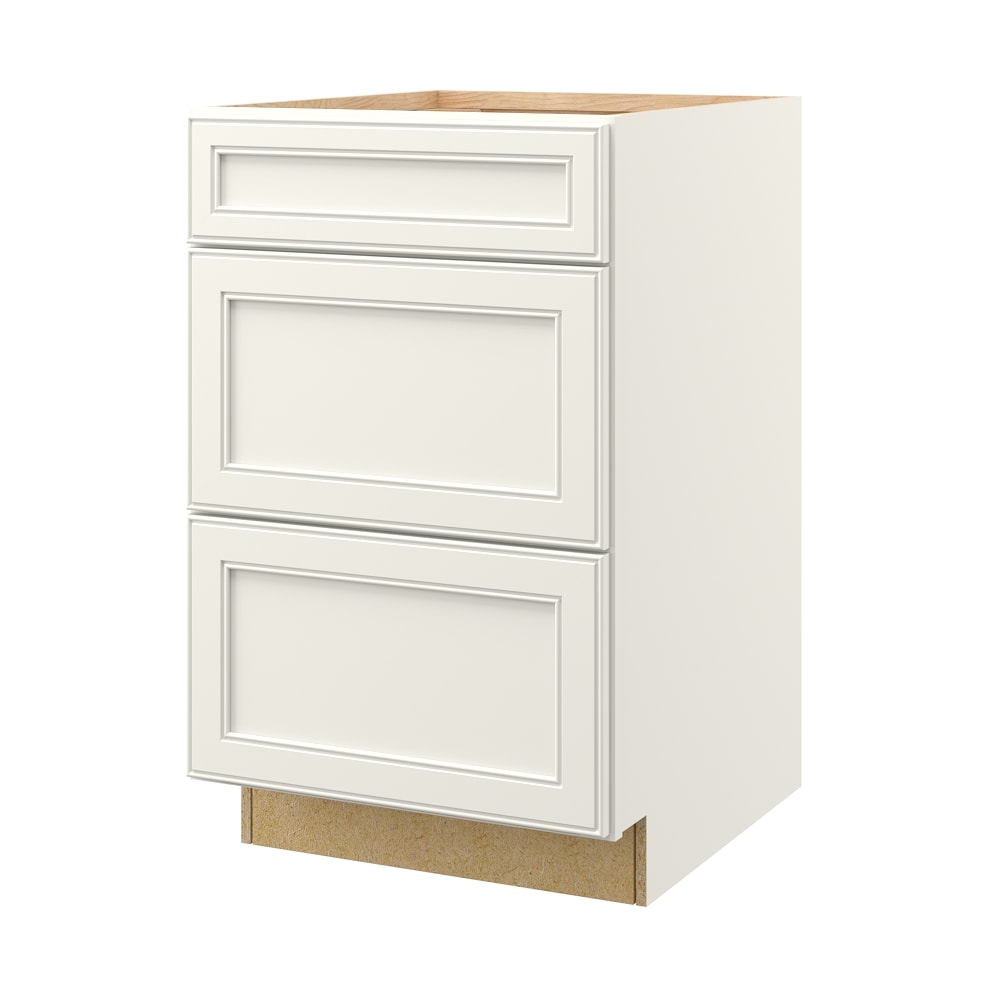 The McKeller Linen 3-Drawer Base Cabinet brings modern elegance and functional storage to your space with its flat panel style. Designed with a true painted finish that combines hardwood and engineered materials, it offers lasting durability and unmatched visual appeal. This fully assembled cabinet simplifies your installation process while enhancing your home's aesthetic.