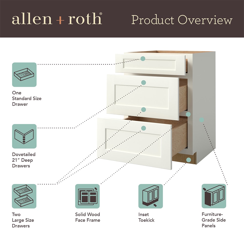 Offering refined craftsmanship, the McKeller 3-Drawer Base Cabinet by allen + roth is a perfect blend of style and functionality for today's upscale kitchens. Its durable construction and modern, seamless design, coupled with a tranquil linen finish, provide a touch of luxury, making it an ideal choice for professional installations and stylish home remodels.