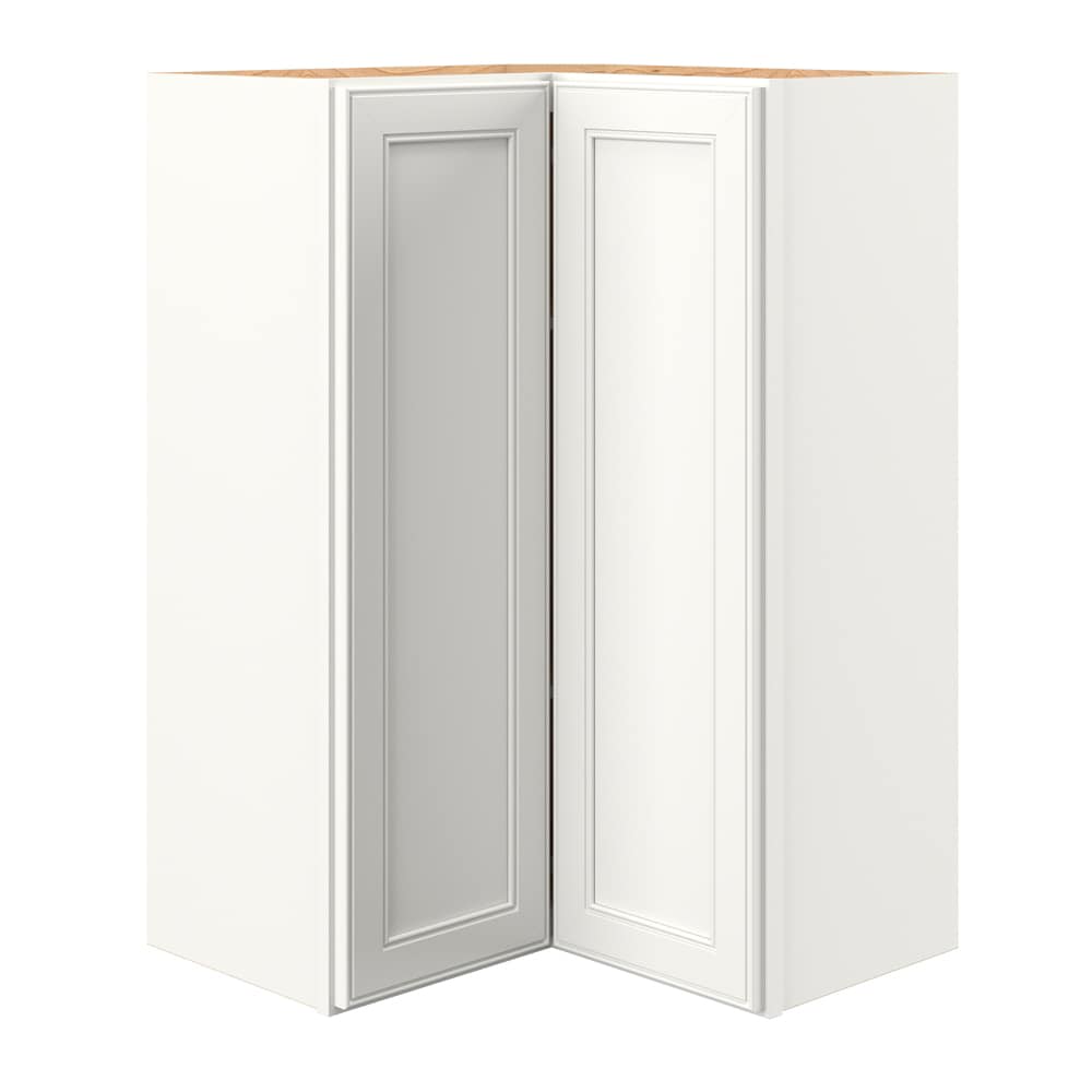 Transform your kitchen with the allen + roth McKeller Linen Diagonal Corner Wall Cabinet. This fully assembled flat panel shaker style cabinet offers modern elegance combined with superior functionality, designed to seamlessly fit into corner spaces while providing ample storage with its adjustable shelves and full overlay doors.