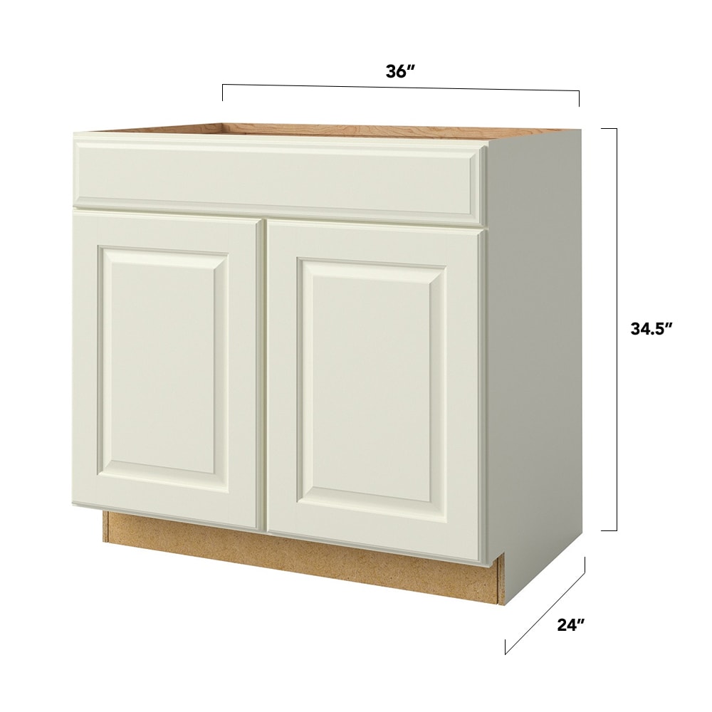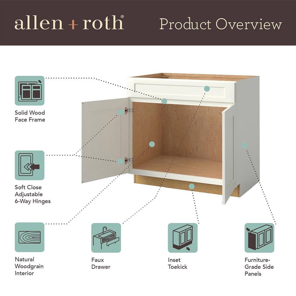 Enhance your kitchen or bathroom with the elegance of the allen + roth Pattingham Harbor Sink Base Cabinet. This fully assembled cabinet features a sophisticated raised panel square design and a pristine painted finish that complements any decor, while the durable construction ensures it withstands daily use. Soft-close doors add a touch of luxury by providing silent and effortless functionality.