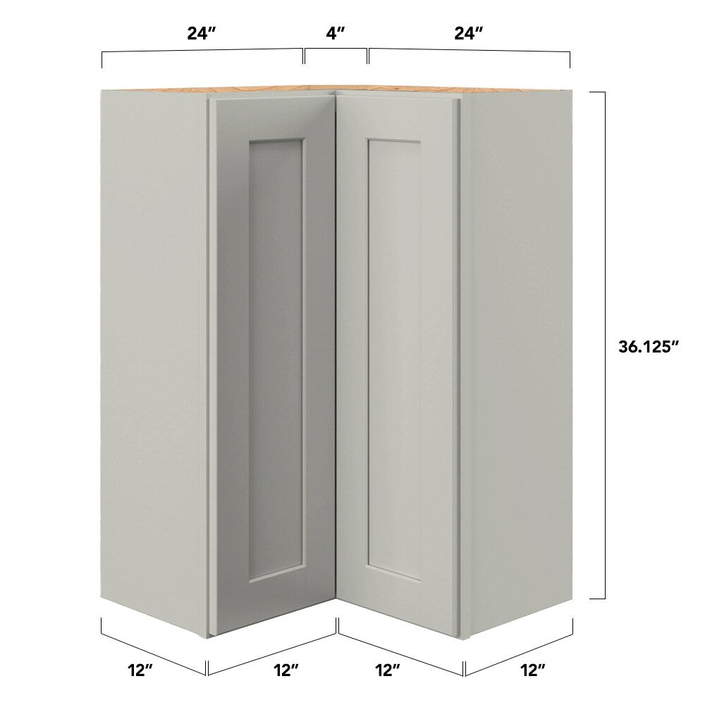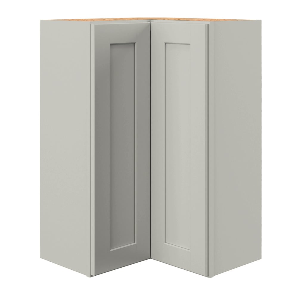 Enhance your space with the allen + roth Stonewall corner wall cabinet, featuring modern flat panel shaker style doors. Designed for superior durability, this fully assembled cabinet effortlessly blends hardwoods with engineered materials and boasts a stunning, durable painted finish.