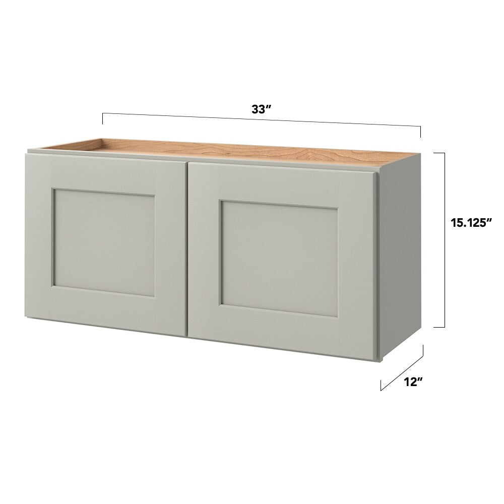 The Stonewall 33-inch wall cabinet by allen + roth combines chic modern aesthetics with robust construction, featuring a sleek flat panel shaker door style. Designed for ease, it comes fully assembled and integrates effortlessly with your kitchen or living space's existing decor.
