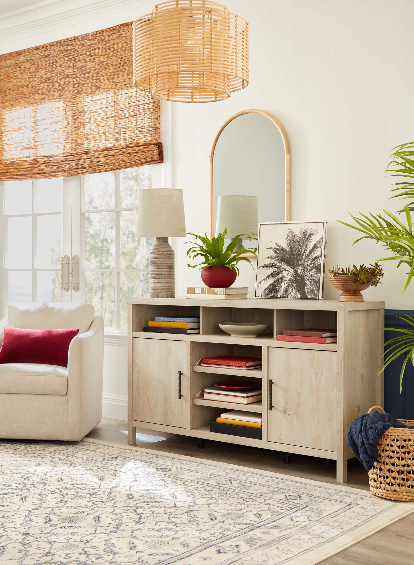 Infuse your living space with a touch of elegance using the Allen + Roth Light Chestnut TV Cabinet. Its stunning light chestnut finish offers a gentle warmth that enhances any room, making it both a centerpiece and a functional storage solution. Featuring adjustable shelving, this cabinet allows you to curate your entertainment setup with ease, providing the flexibility to display or hide your electronics and decor. Whether it's for a chic modern loft or a classic family room, this cabinet is an indispensable asset to luxury living.