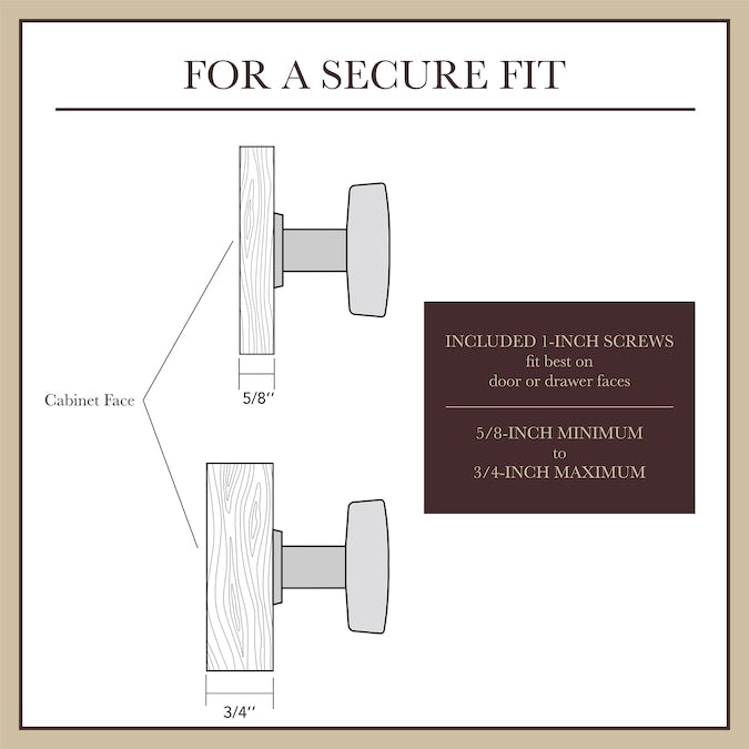 A: The Beaumont drawer pull features a rear-mount installation, and includes two 1-inch screws for securing it to drawer faces or cabinet doors with a thickness of 5/8-inch to 3/4-inch.