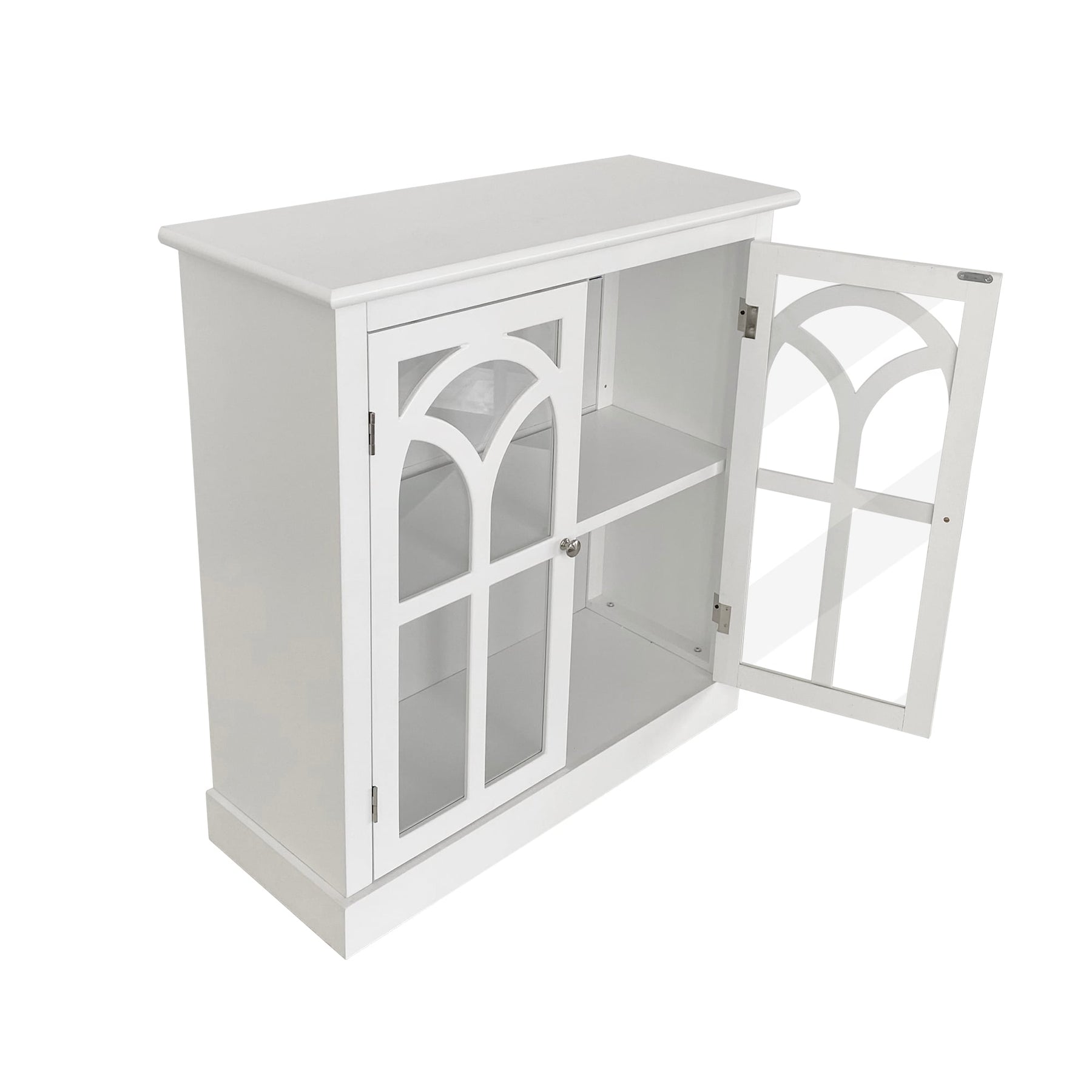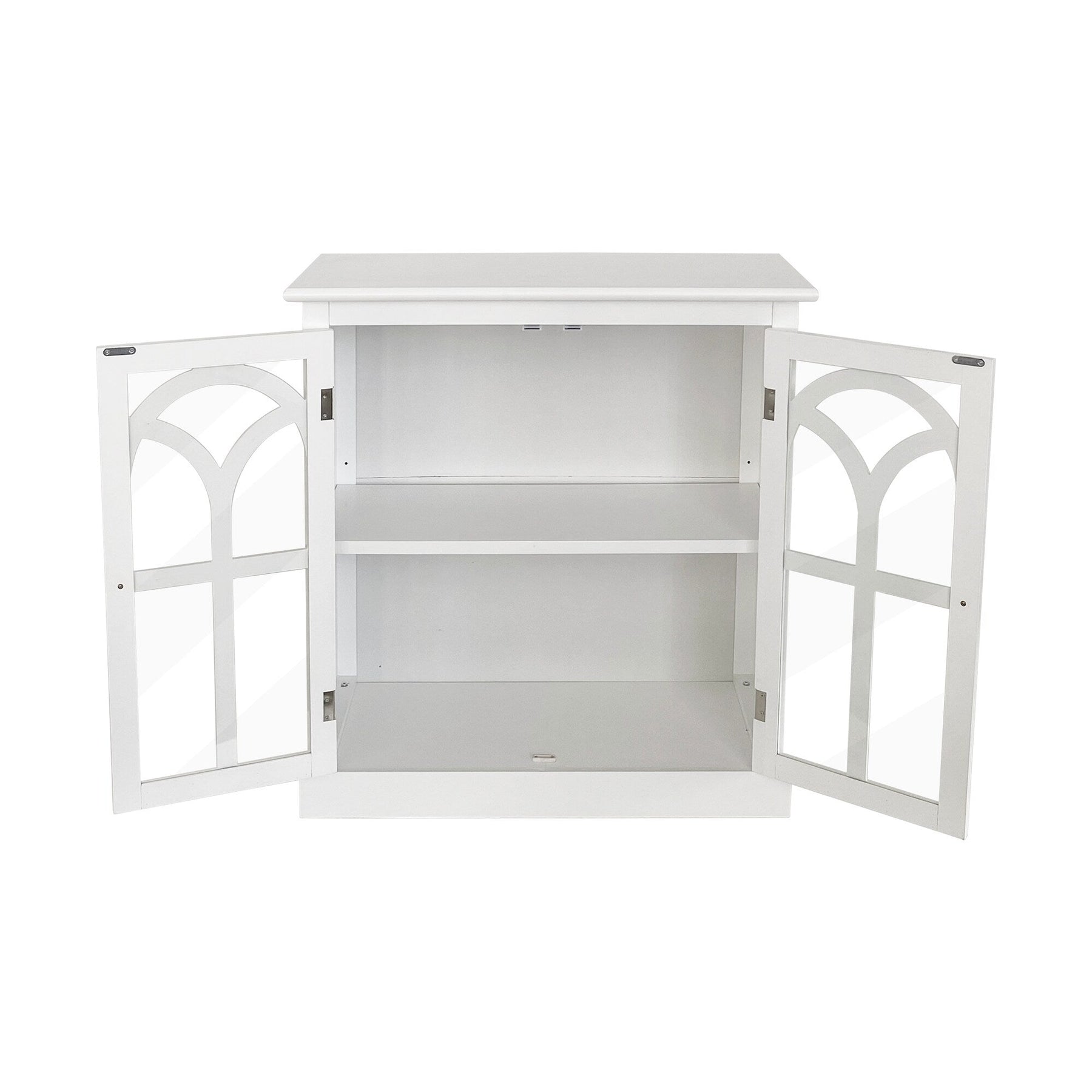 A: The cabinet features two doors, offering easy access to the internal storage shelf.