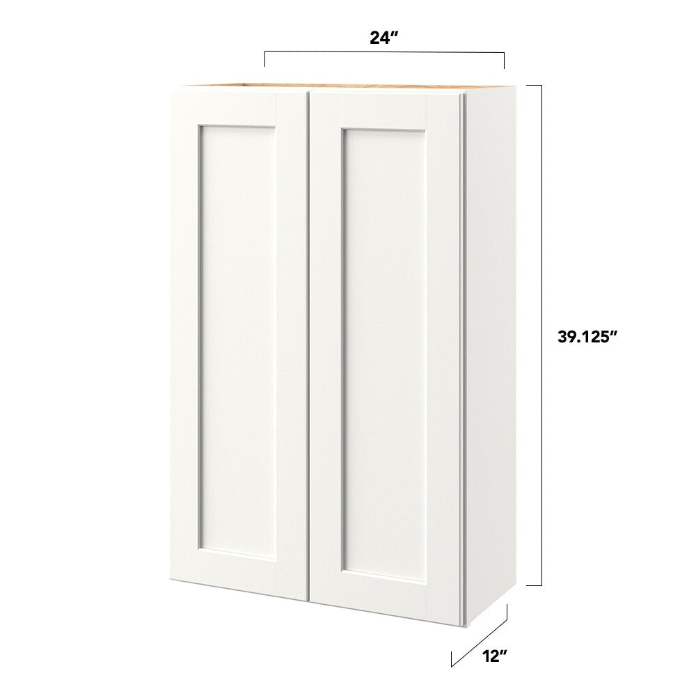 The Aveley 24-inch Linen Wall Cabinet by allen + roth offers refined style with a functional design for modern kitchens or bathrooms. Fully assembled with a painted finish for durability, this cabinet features soft-close technology and adjustable shelves, providing elegance and convenience. It is designed with a timeless shaker door style and a seamless full overlay finish.
