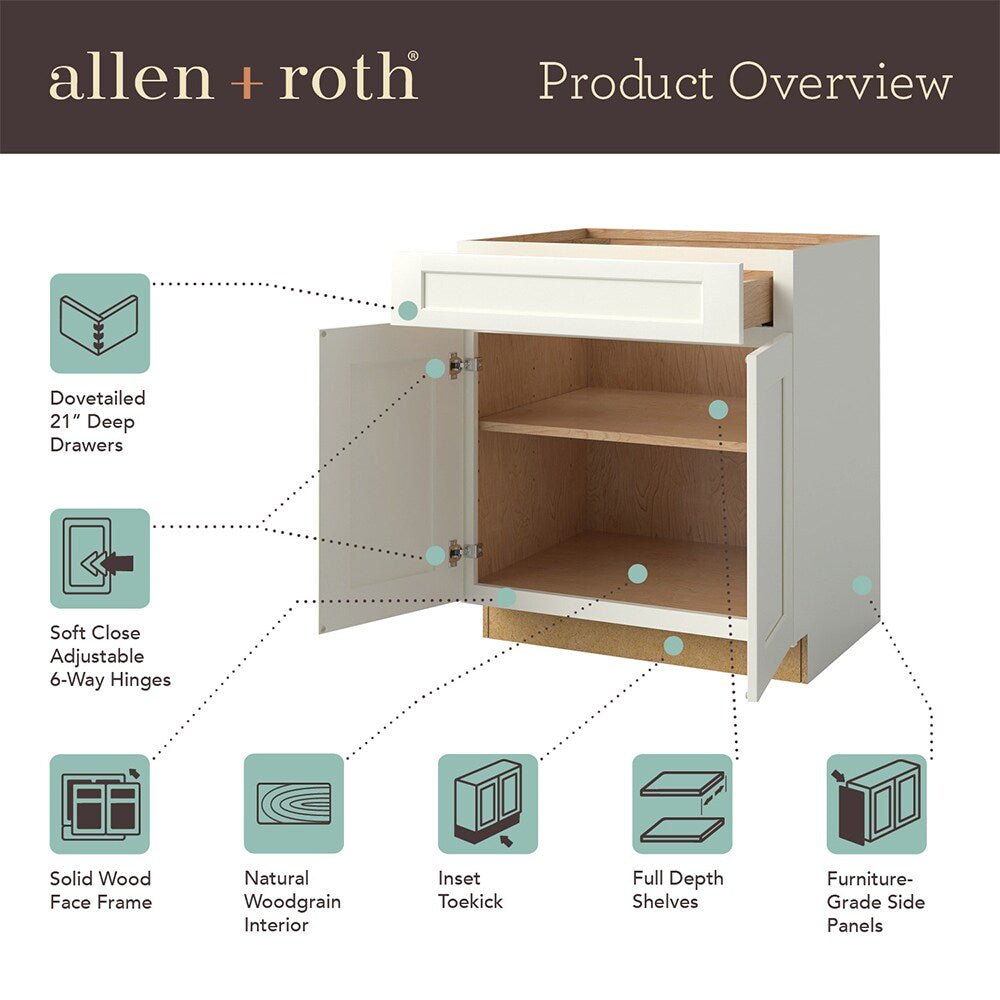 The Allen + Roth Aveley Linen Shaker Base Cabinet offers a sophisticated, modern design with its bright white finish and flat panel style. Fully assembled, this cabinet ensures effortless installation and features a soft-close system for a quiet, streamlined kitchen experience. Designed for durability and style, it's the ideal choice for contemporary spaces seeking seamless integration.