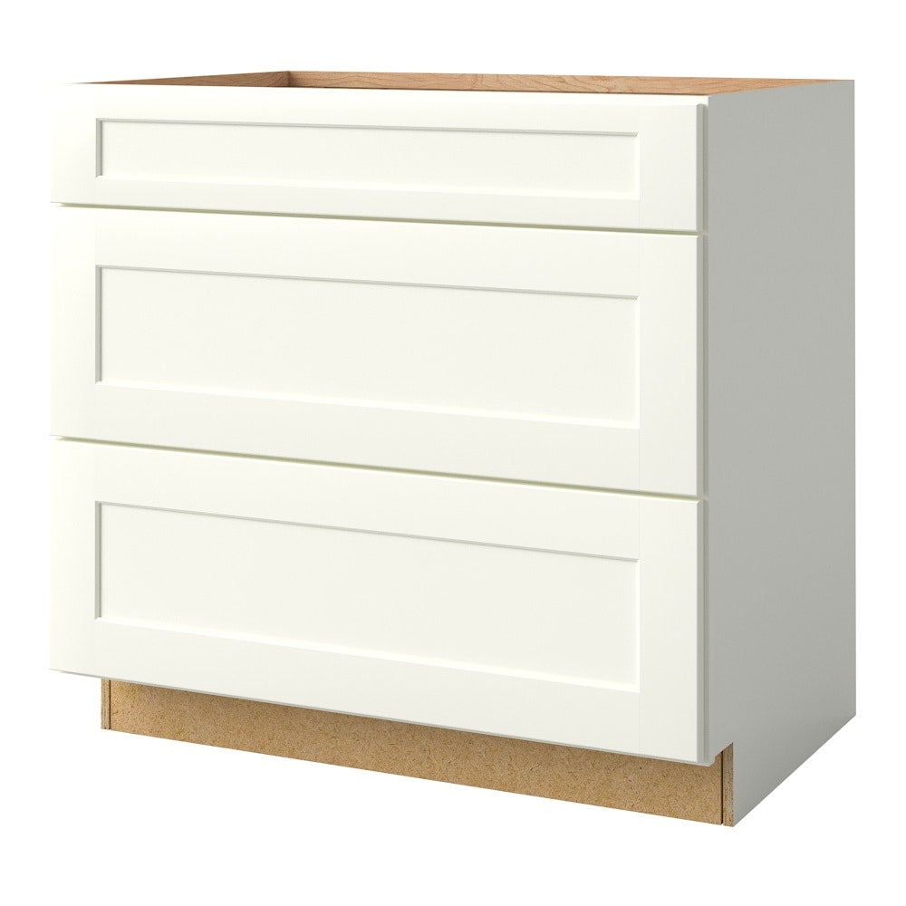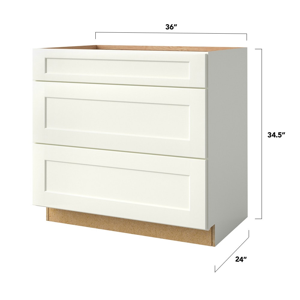 Elevate your kitchen's ambiance with the allen + roth Aveley 36-in Linen 3-Drawer Base Cabinet. Featuring a true painted bright white finish and modern flat panel style, this cabinet blends seamlessly into any décor while offering extensive storage solutions. Experience the luxury of soft-close drawers and superior craftsmanship backed by a lifetime warranty.