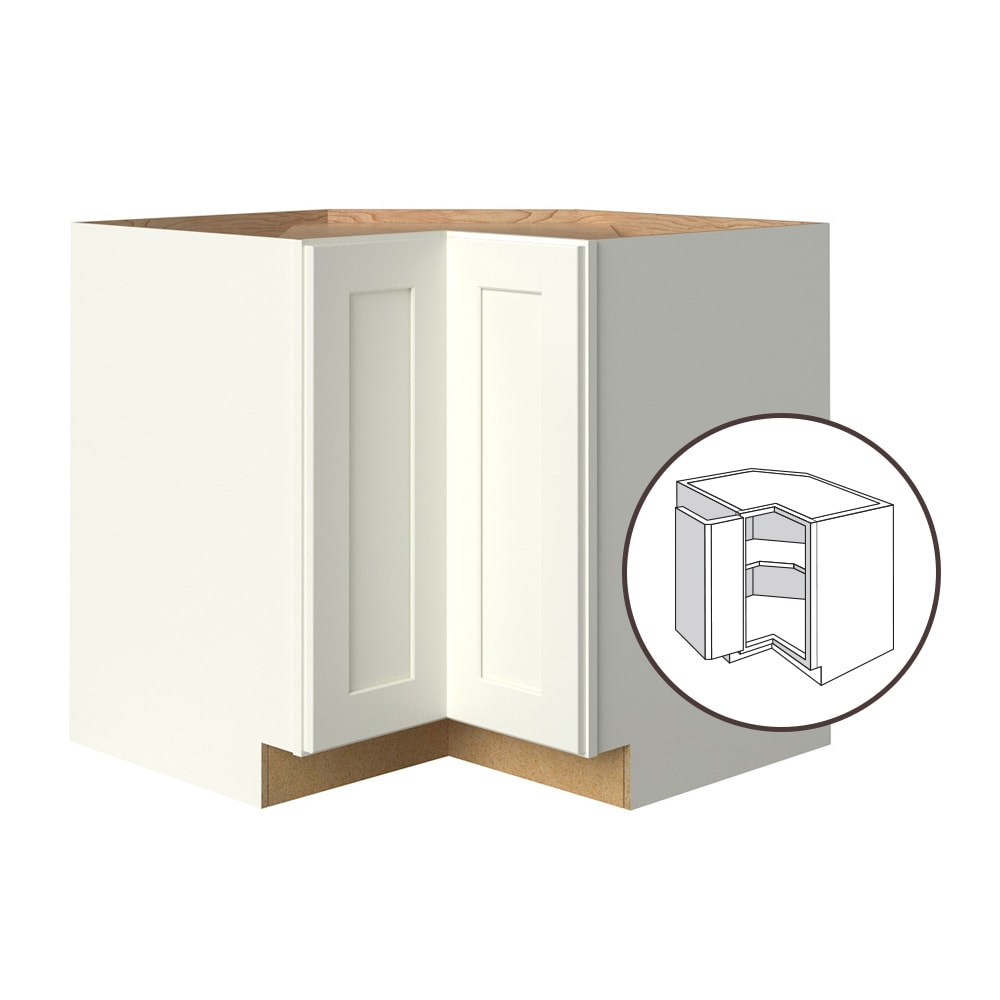 Maximize corner space with the allen + roth Aveley Diagonal Base Cabinet, boasting a chic linen finish and modern shaker style. Fully assembled, it's designed to seamlessly fit into your kitchen with robust construction and ample storage solutions.