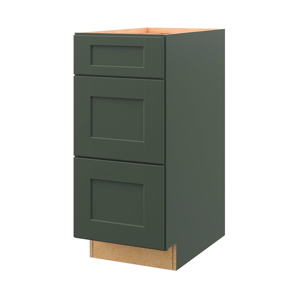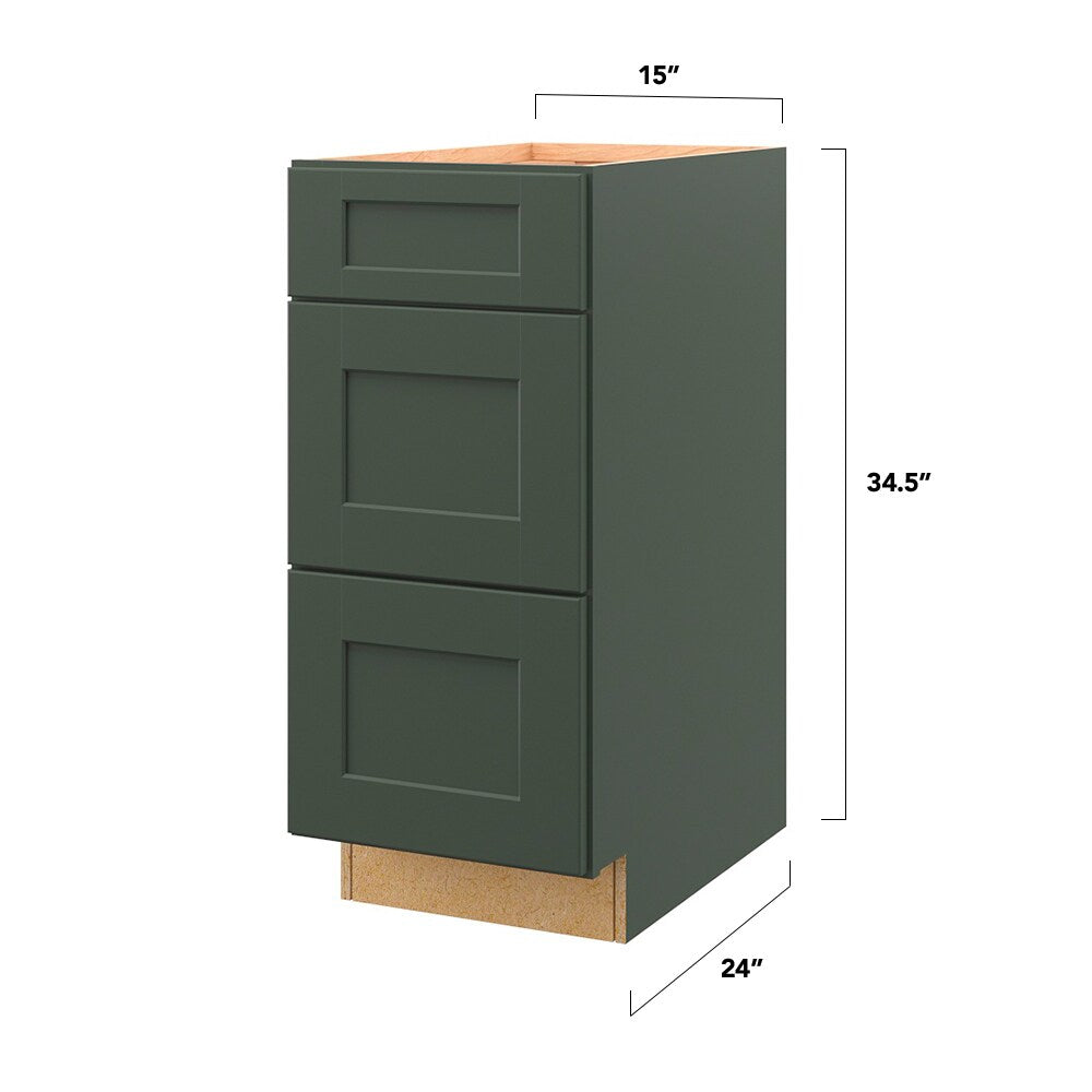 The Allen + Roth Galway 15" Sage 3-Drawer Base Cabinet brings a fresh aesthetic to your kitchen or bathroom with its flat panel style and elegant sage finish. Beyond aesthetics, it combines premium woods and engineered materials for lasting durability, featuring soft-close drawers and dovetail construction that offer both function and style.