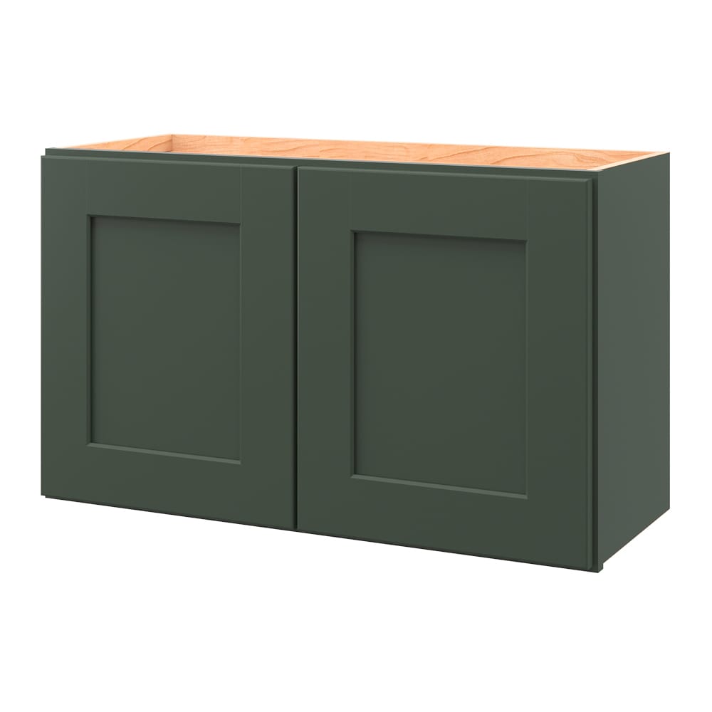 Enhance your living space with the allen + roth Galway Wall Cabinet in a sophisticated sage finish. This fully assembled cabinet features a flat panel Shaker door style, offering a seamless blend of durability and modern design for an elevated home aesthetic.