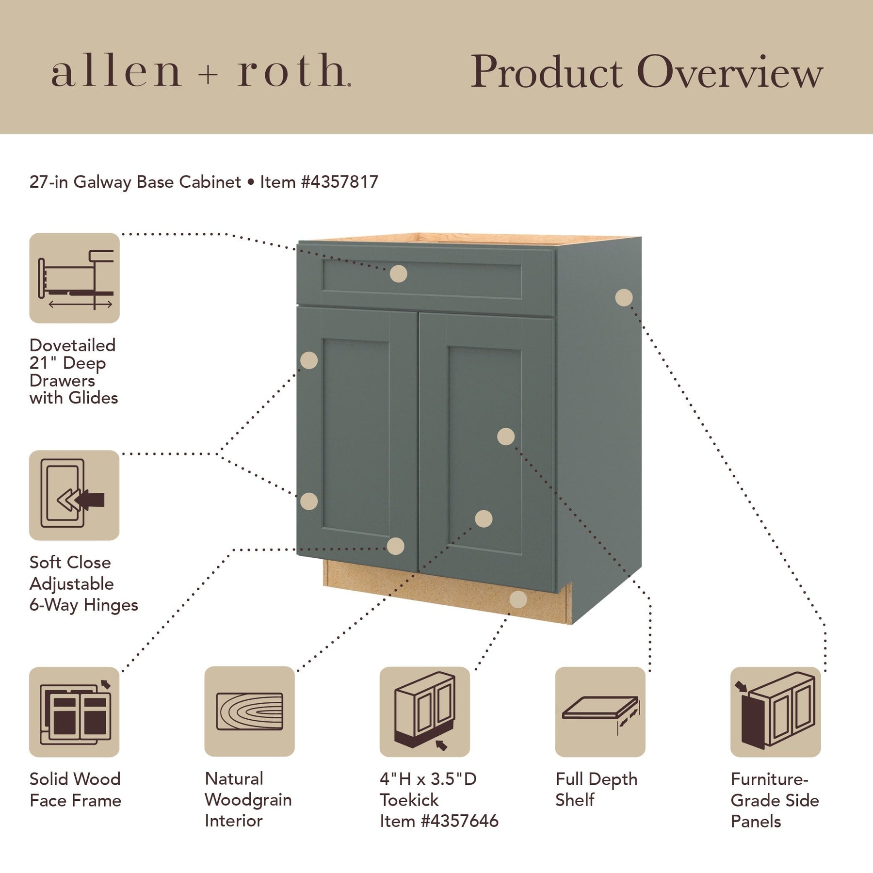 Add a touch of elegance to your space with the allen + roth Galway Sage 2-Drawer Base Cabinet. This fully assembled, modern-style cabinet features a smooth flat panel design, built for durability with its hard wood and engineered material blend. Perfect for both aesthetic and practical storage, it includes soft-close drawers and boasts a sleek sage finish.