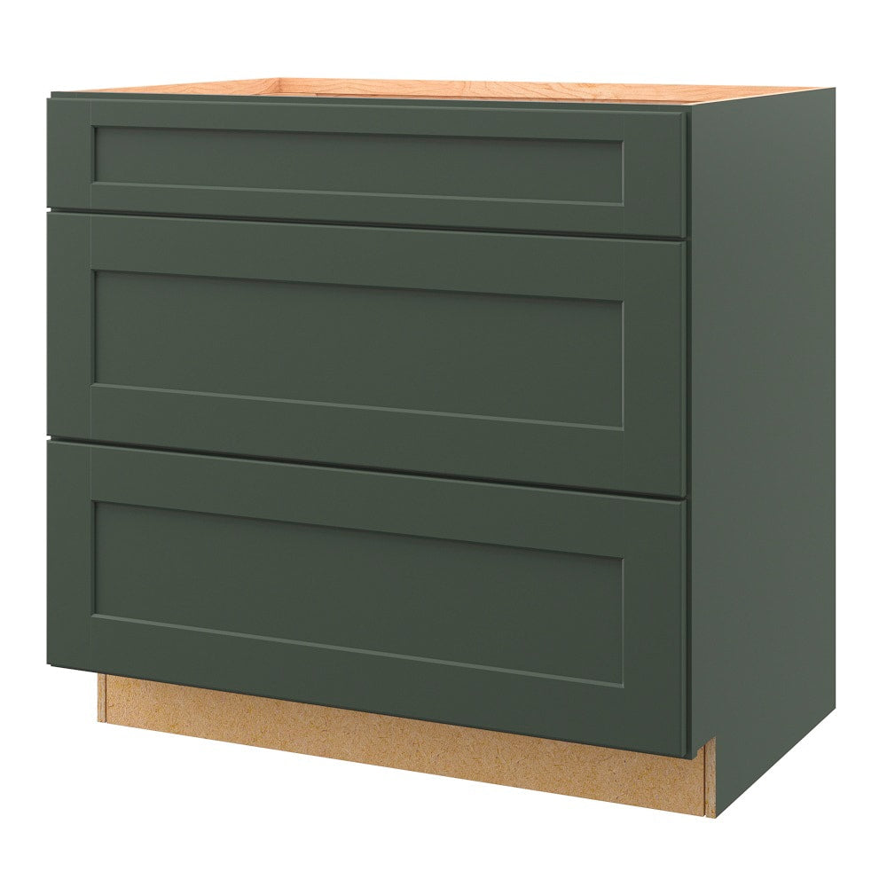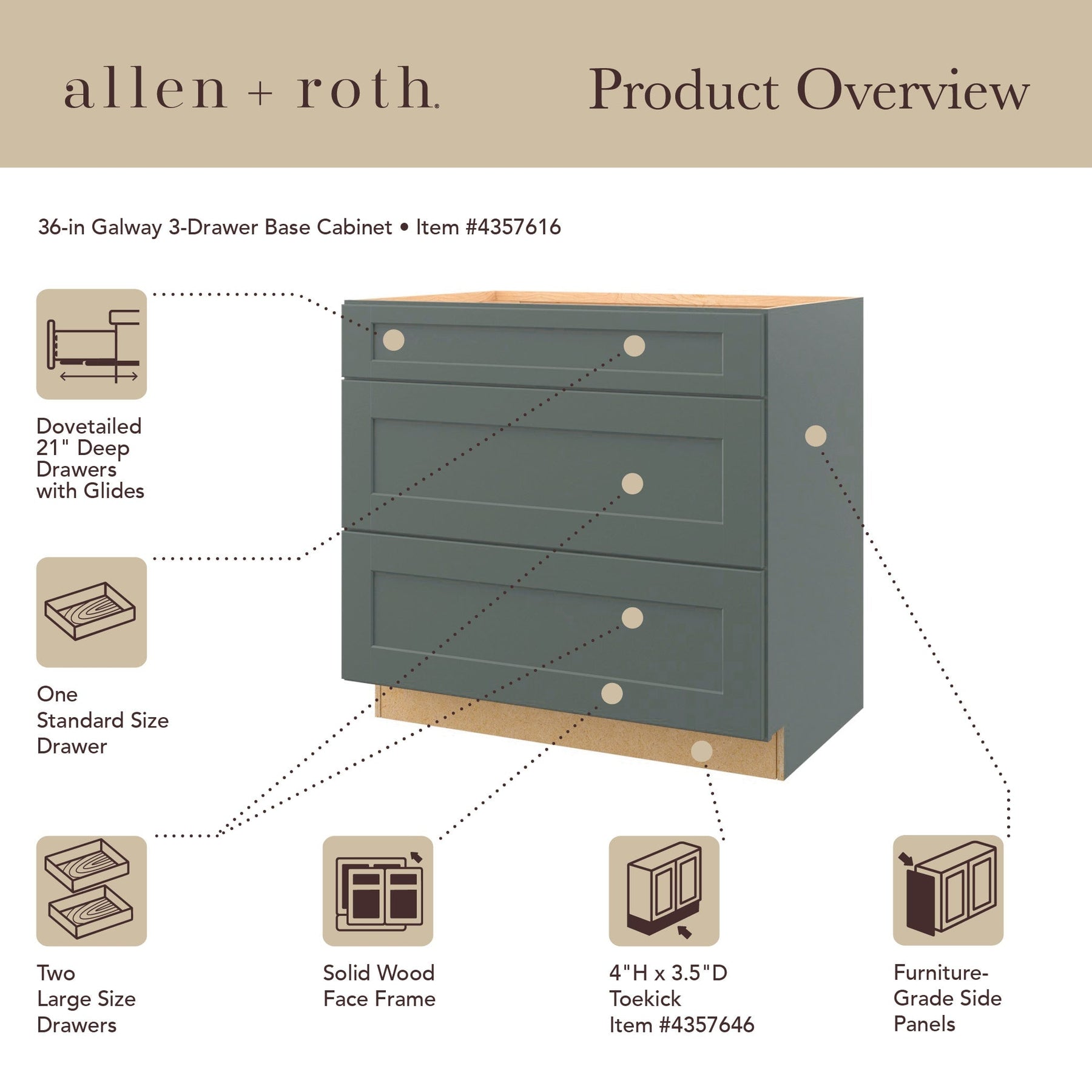 The allen + roth Galway Sage 3-Drawer Base Cabinet provides an elegant, modern addition to any home renovation project. Fully assembled with a sophisticated flat-panel design and a soothing dark green finish, this durable piece offers both style and function for kitchen or workspace storage.