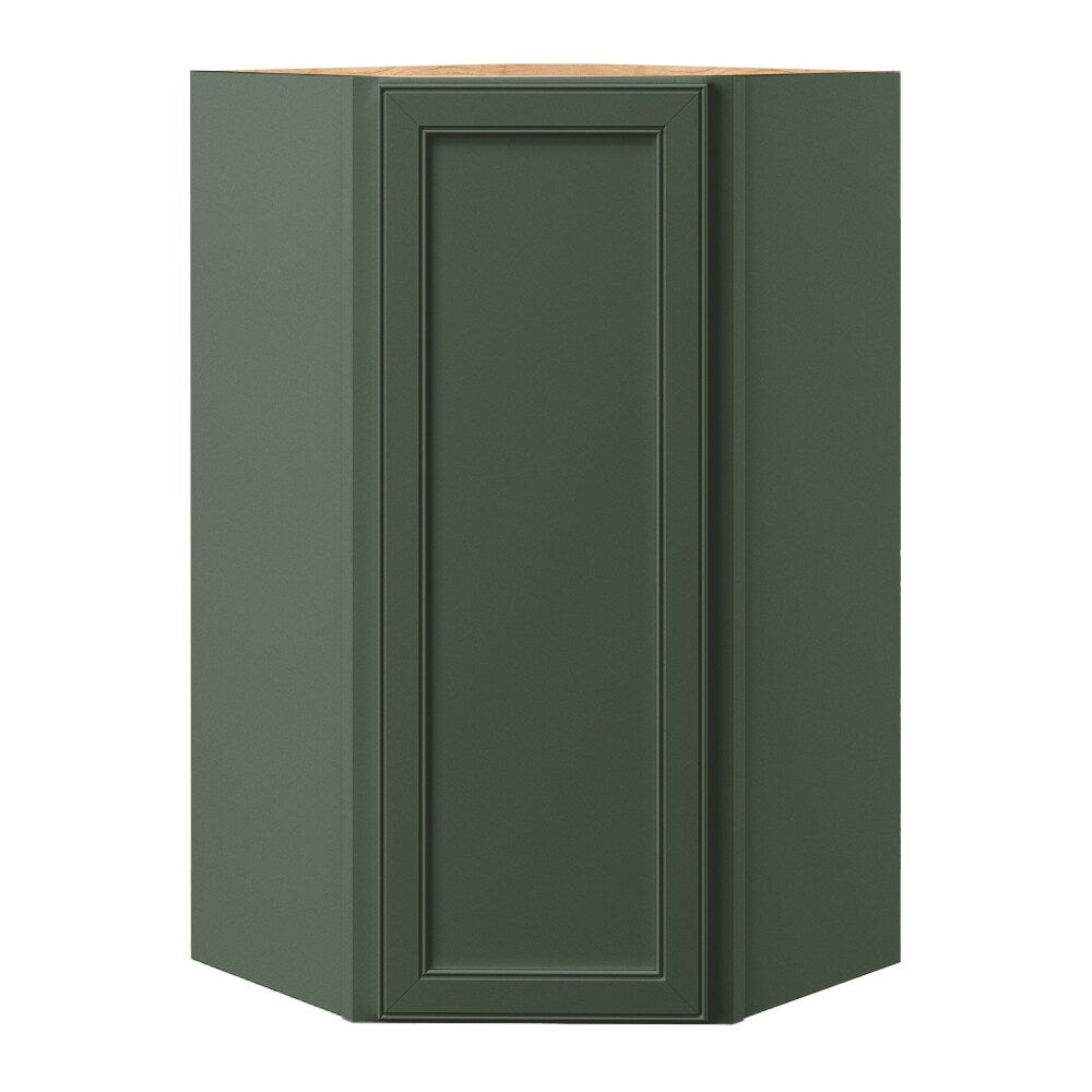 Transform your kitchen or bath with the allen + roth Heathrow Sage Diagonal Corner Wall Cabinet. Its painted sage finish and recessed panel square style create a timeless, stylish look while its sturdy construction ensures lasting durability. Soft-close features and adjustable shelves offer the perfect balance of functionality and elegance.