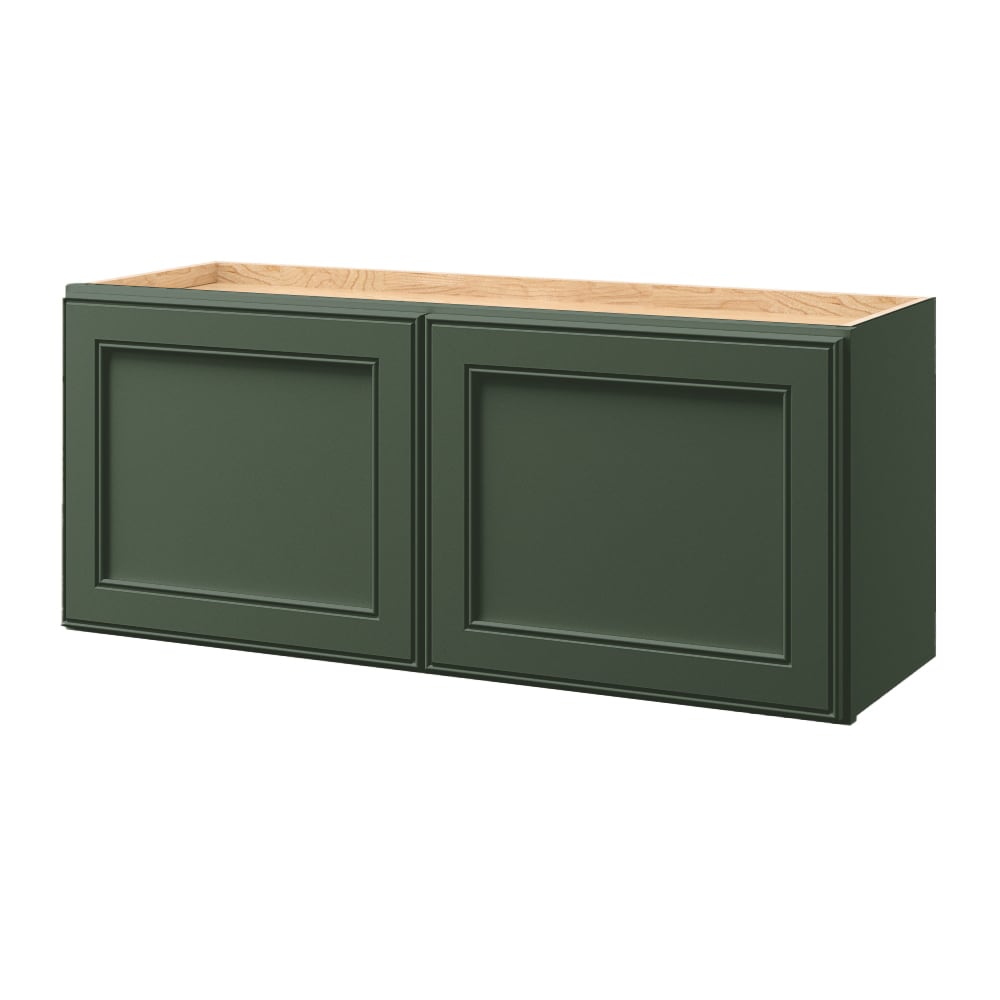 The allen + roth Heathrow Sage Wall Cabinet offers a stylish and functional upgrade to any space. Featuring a transitional design with a classic recessed panel square door style, this cabinet is pre-assembled for easy installation. With its durable construction and modern full overlay doors, it seamlessly blends into any décor.