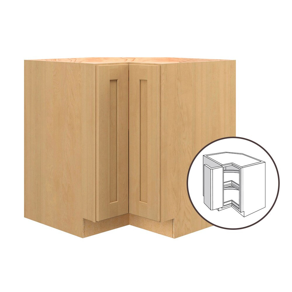 Upgrade your kitchen's functionality with the allen + roth Innsbrook Lazy Susan Corner Cabinet. This fully assembled, flat panel Shaker-style cabinet enhances storage with a sleek modern look. Featuring an expertly-crafted wood spin unit, it maximizes corner space while adding a touch of warmth with its light Rye finish.