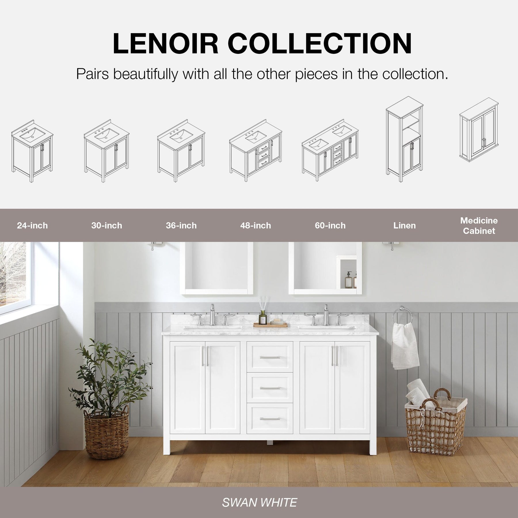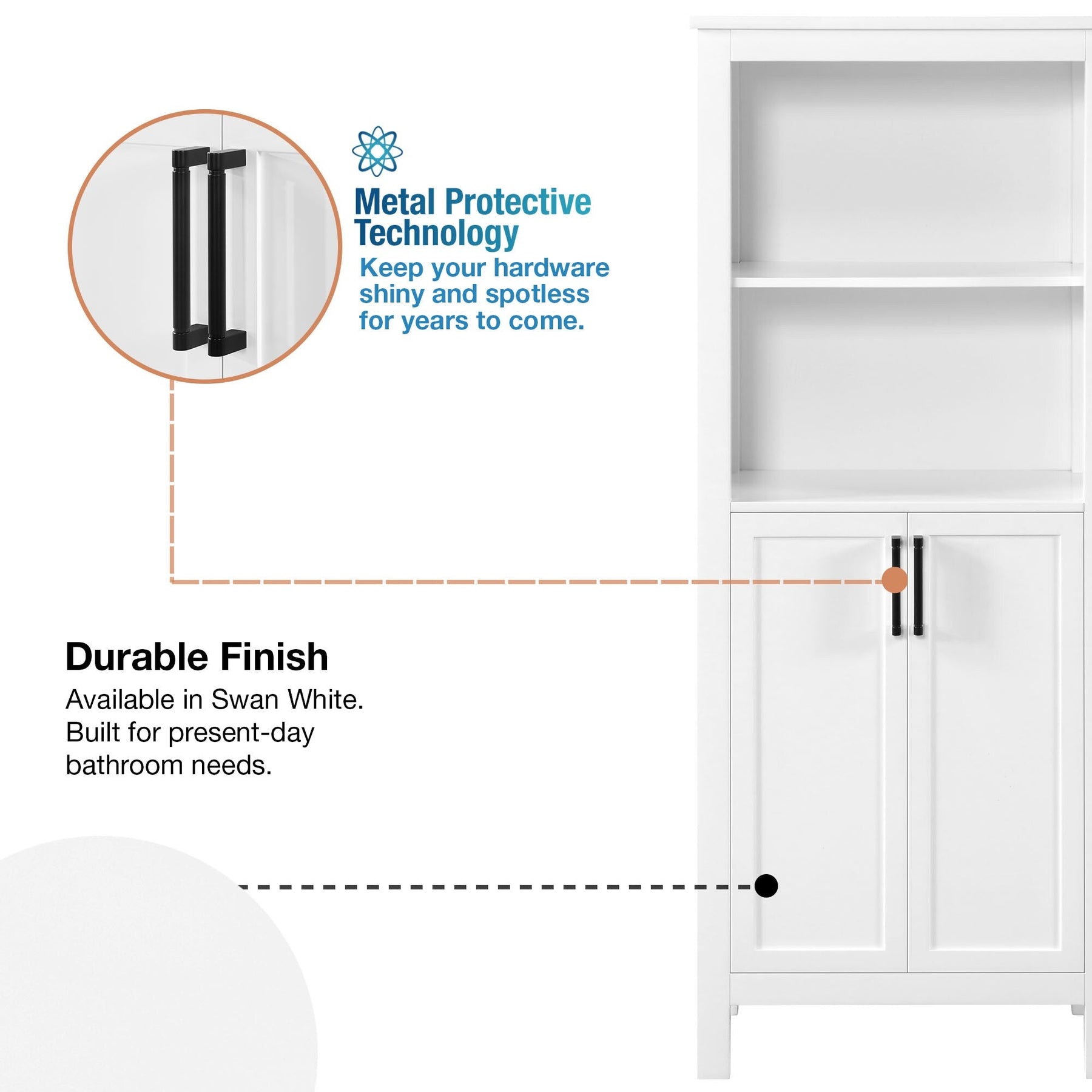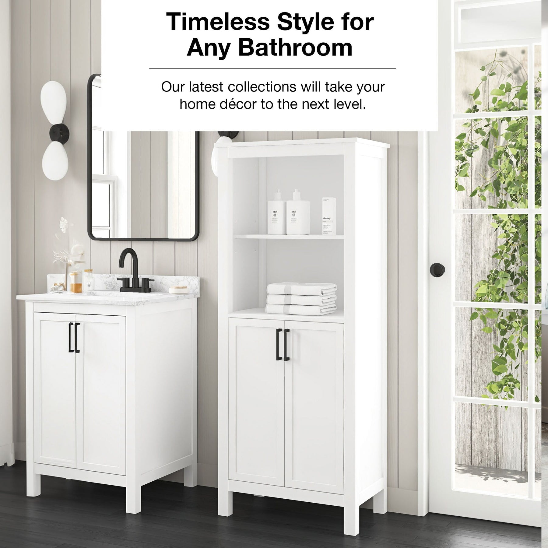 Transform your bathroom into a serene sanctuary with the allen + roth Lenoir Linen Cabinet. Its creamy Swan White finish exudes an ethereal quality, enhancing any decor with subtle elegance. The cabinet's classic shaker design paired with modern soft-close doors provides a perfect balance of timeless charm and contemporary convenience. Use it to display your finest linens or organize essentials in style—an essential piece that whispers luxurious living with every detail.