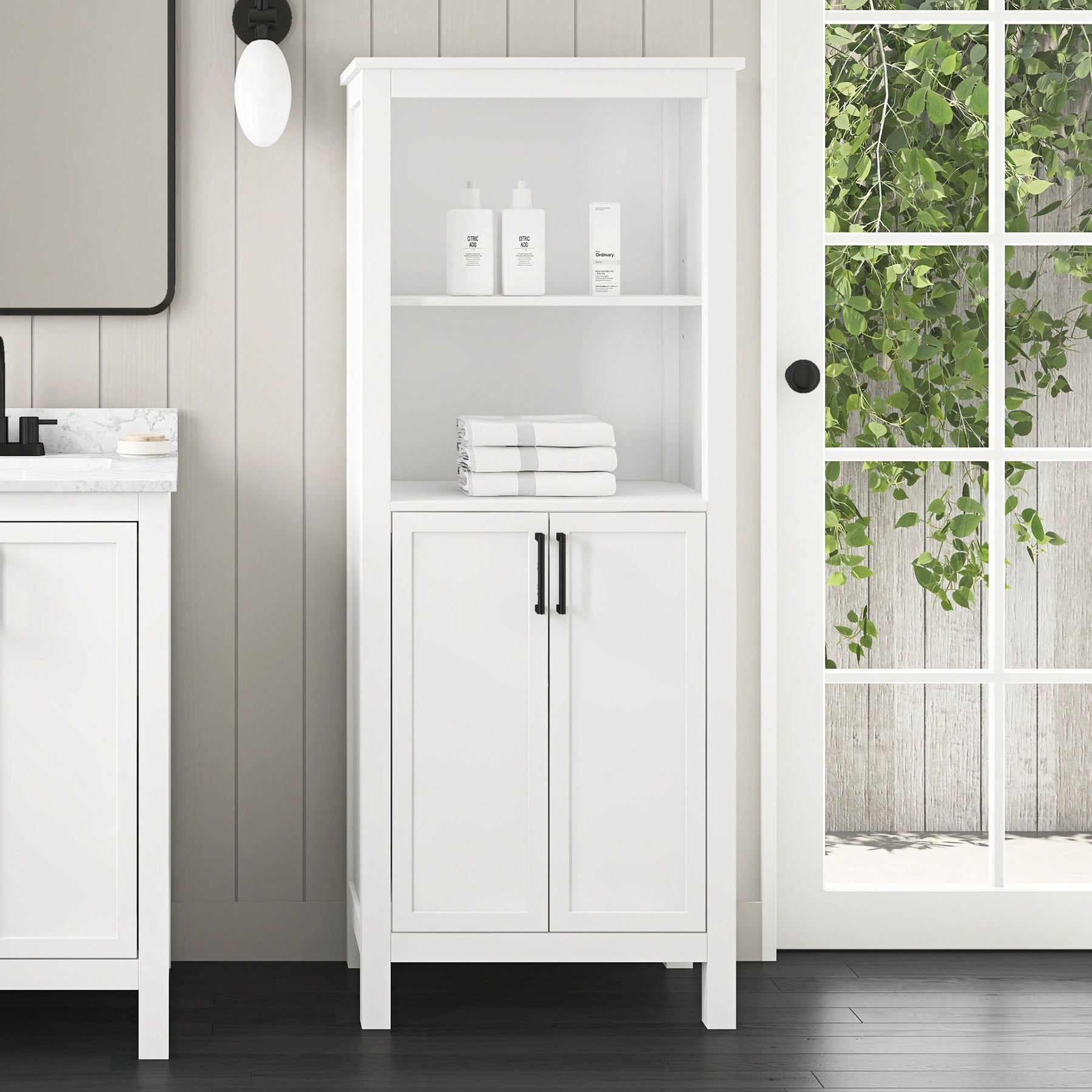 Elevate your bathroom's style with the allen + roth Lenoir Soft Close Linen Cabinet. Expertly crafted from solid wood and MDF, this cabinet in a sophisticated Swan White finish combines functionality with elegance. Its freestanding design includes adjustable shelving and soft close doors for seamless storage solutions.