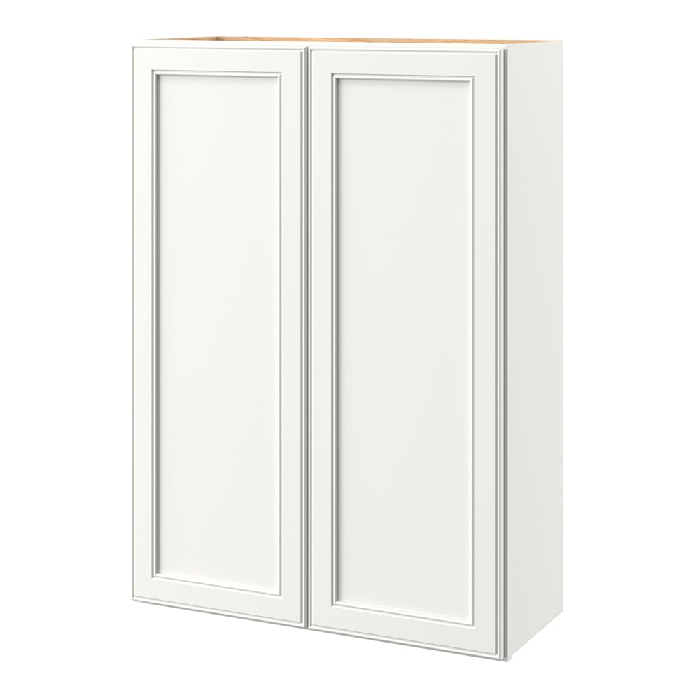 Introducing the allen + roth McKeller Linen Wall Cabinet - a perfect blend of elegance and functionality for your kitchen or bathroom. This 30-in wide, fully assembled cabinet boasts a sophisticated flat panel Shaker design with a smooth, crisp white finish, easily fitting into modern decor with its full overlay doors and quiet, soft-close hinges.