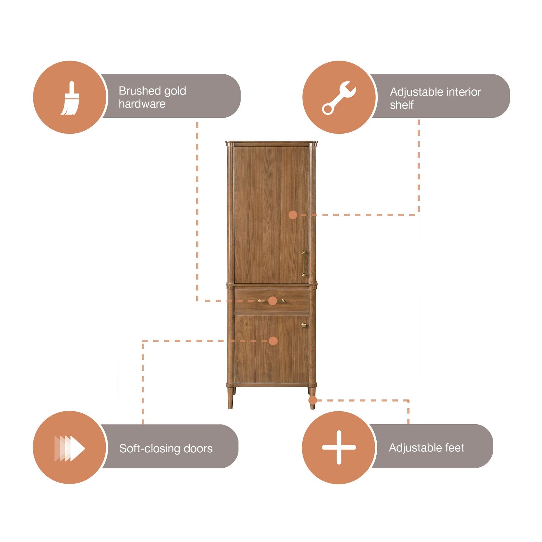 Elevate your bathroom's functionality and style with the allen + roth Rian Linen Cabinet. This freestanding cabinet offers a perfect blend of warm walnut wood and elegant brushed gold hardware, complete with soft-close technology for seamless operation.