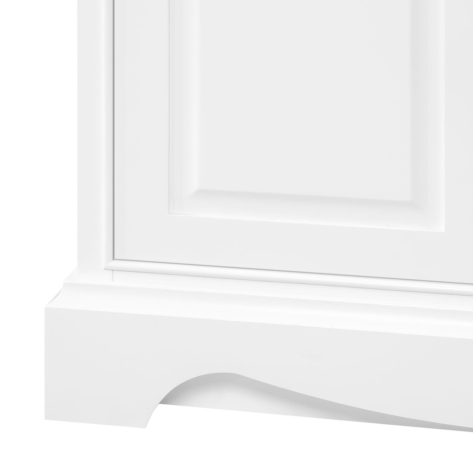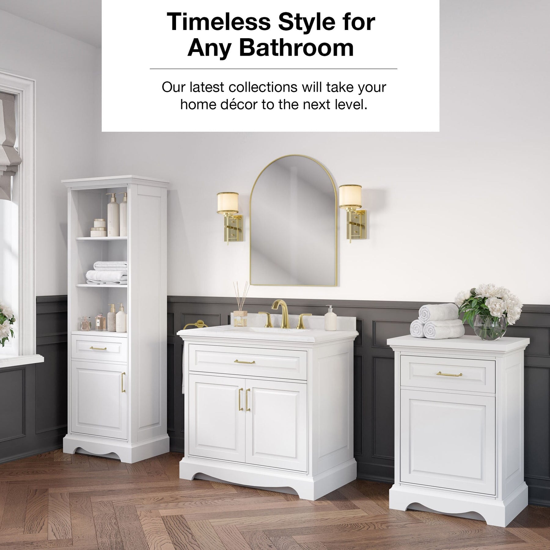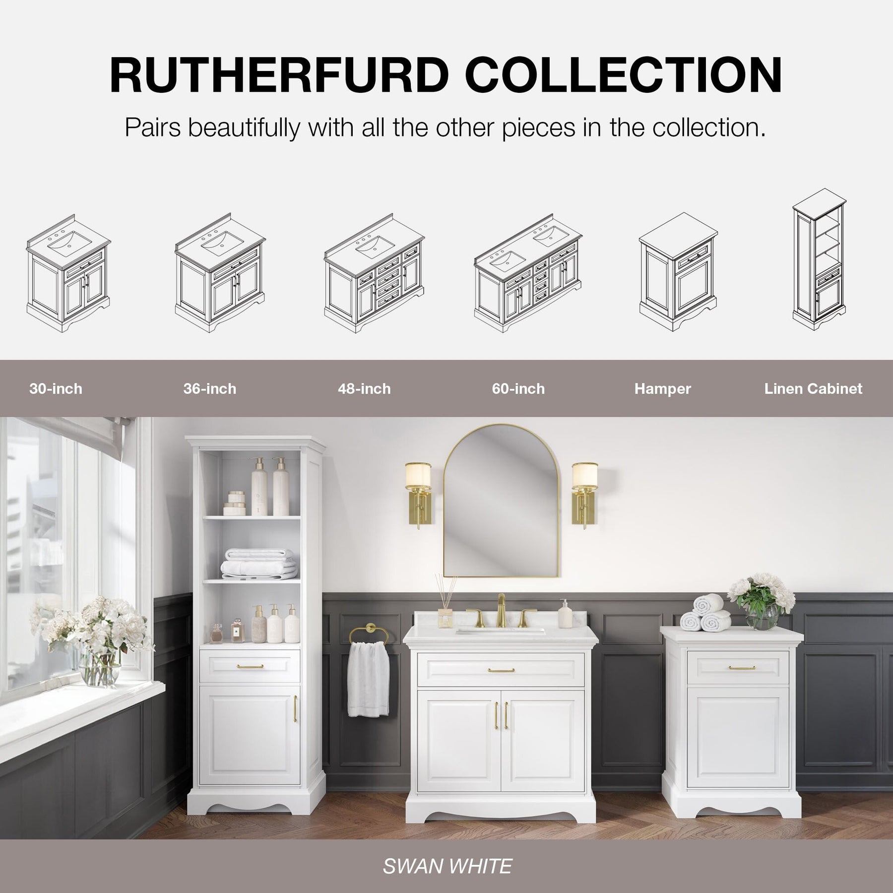 Elevate your bathroom storage with the allen + roth Rutherfurd Linen Cabinet, featuring a sophisticated swan white finish and soft-close hinges for a touch of elegance. This freestanding cabinet combines classic design with practical functionality, offering multiple storage options to keep your space organized and serene.