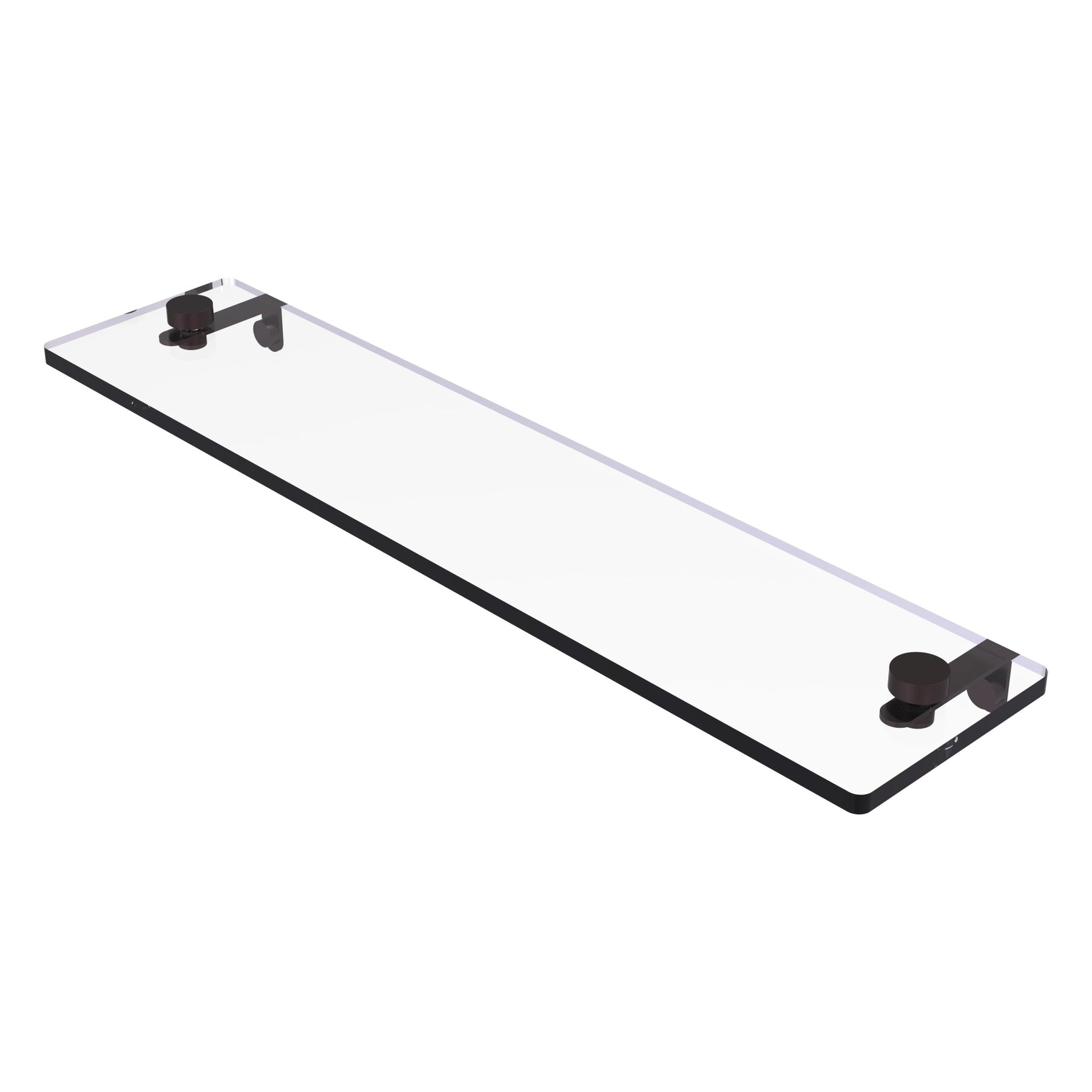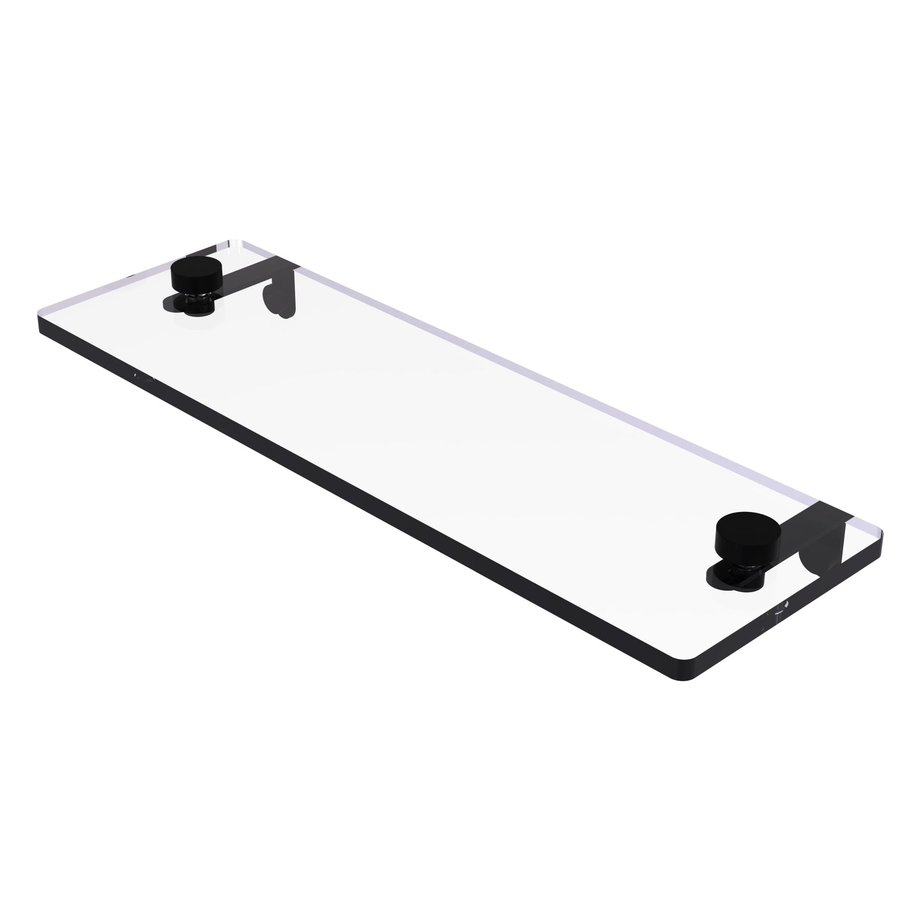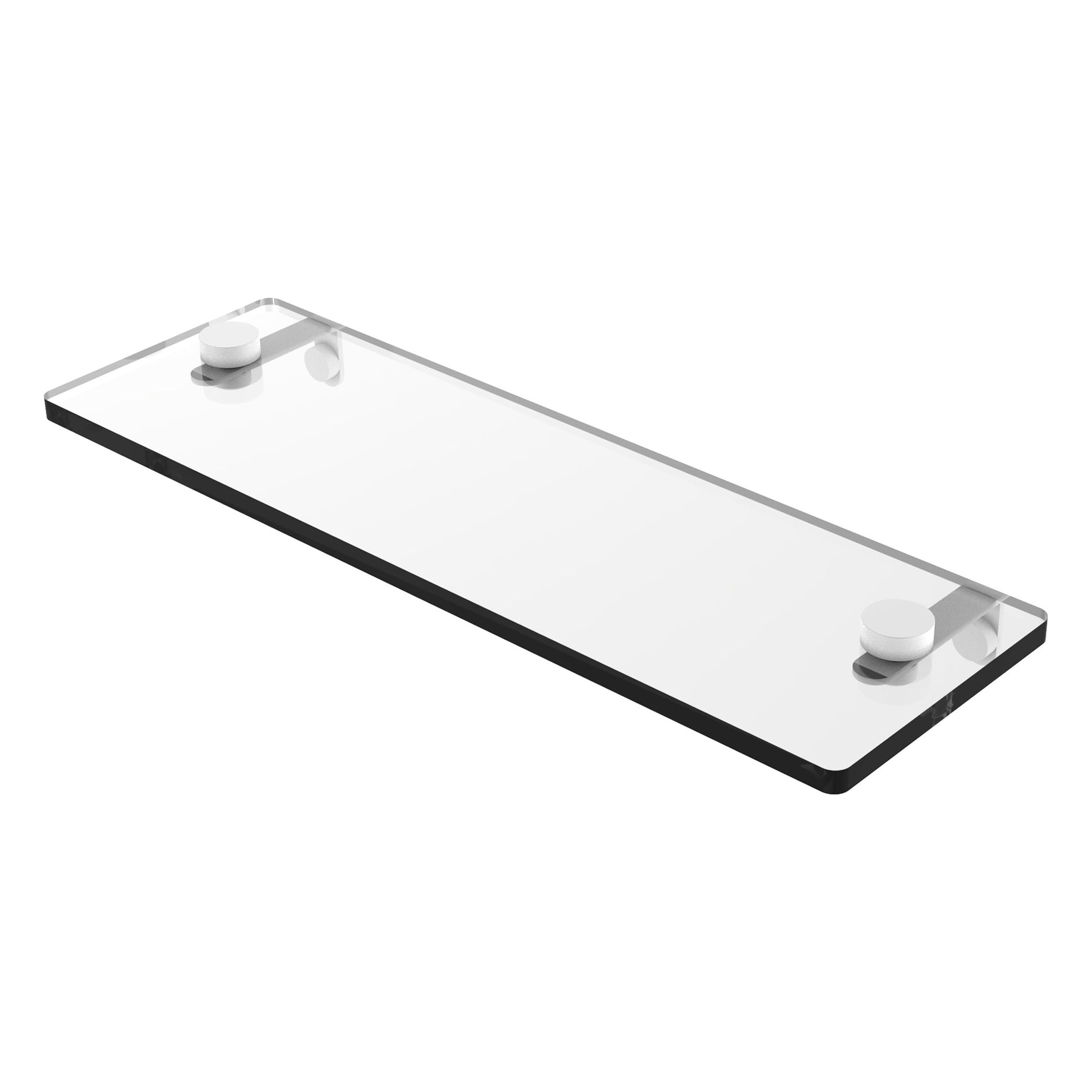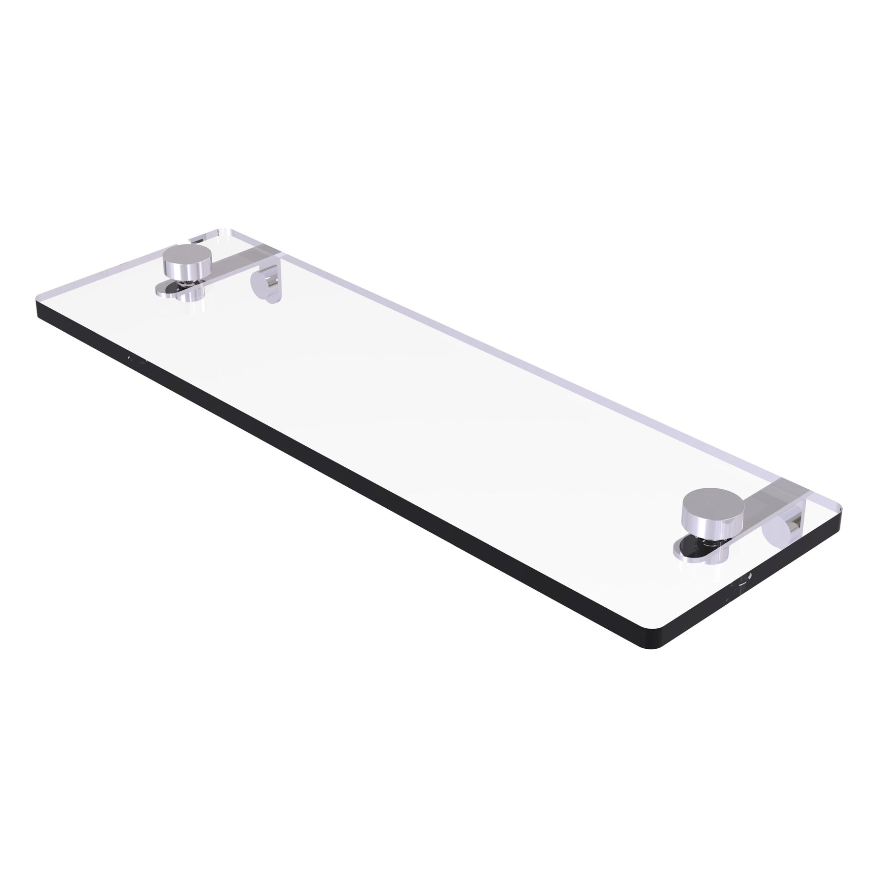 A sleek tempered glass vanity shelf with solid brass hardware for durable, contemporary storage. The 16-inch shelf features beveled edges and concealed-screw wall mounts in a satin nickel finish—ideal for adding organization without bulk.