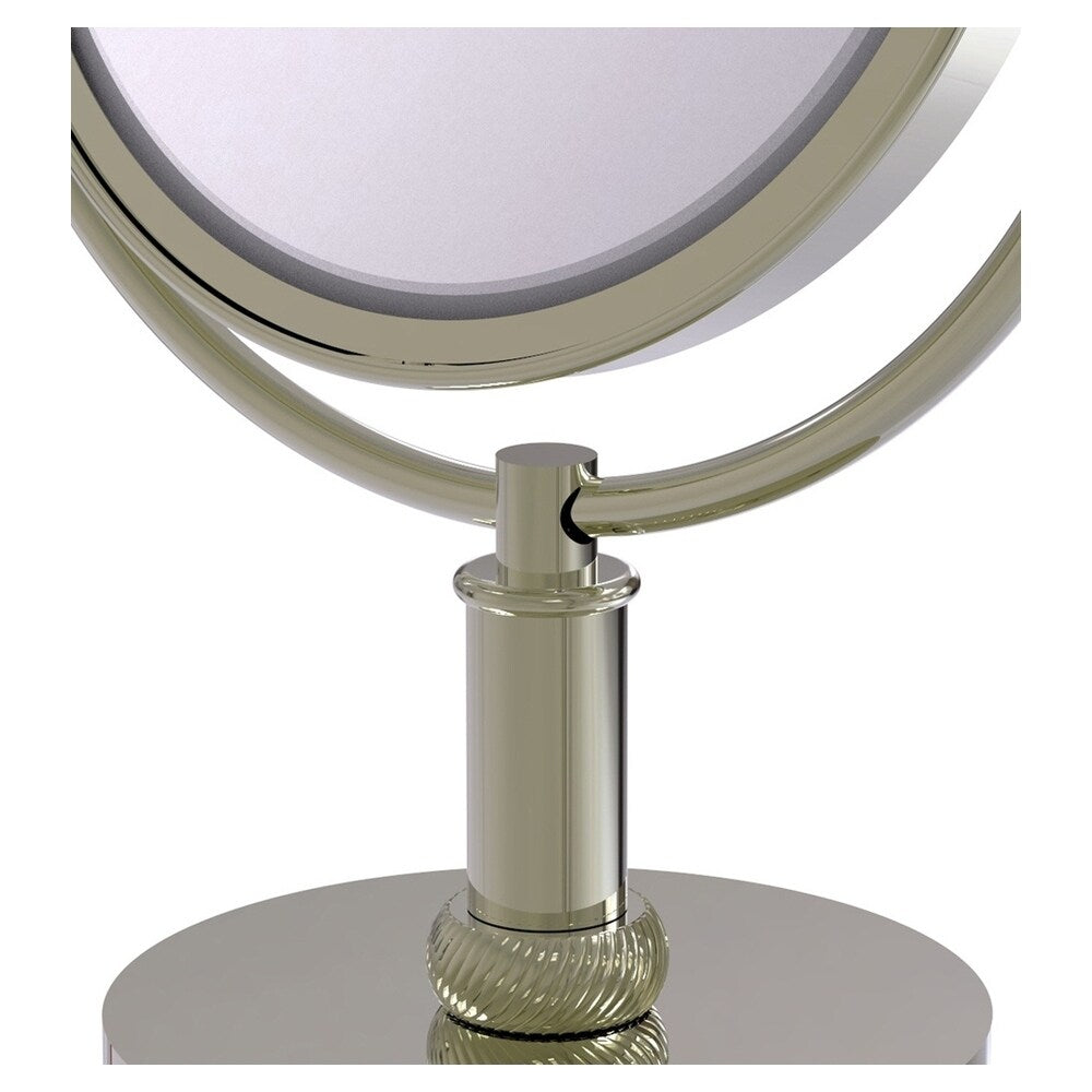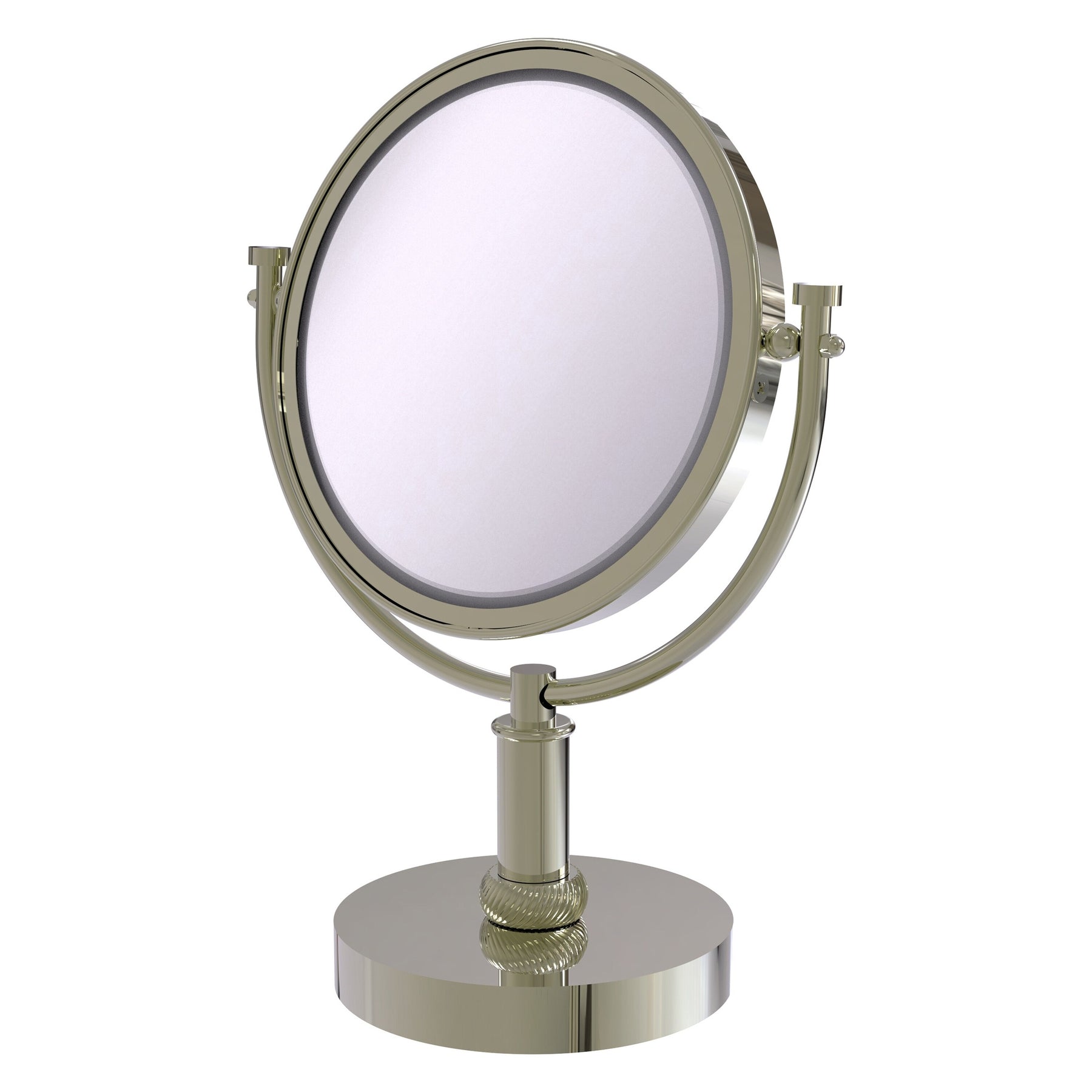 Elevate your daily routine with this 8-inch double-sided countertop vanity mirror from Allied Brass. Crafted from solid brass with a polished nickel finish, it features 2x magnification and a weighted base for stability.