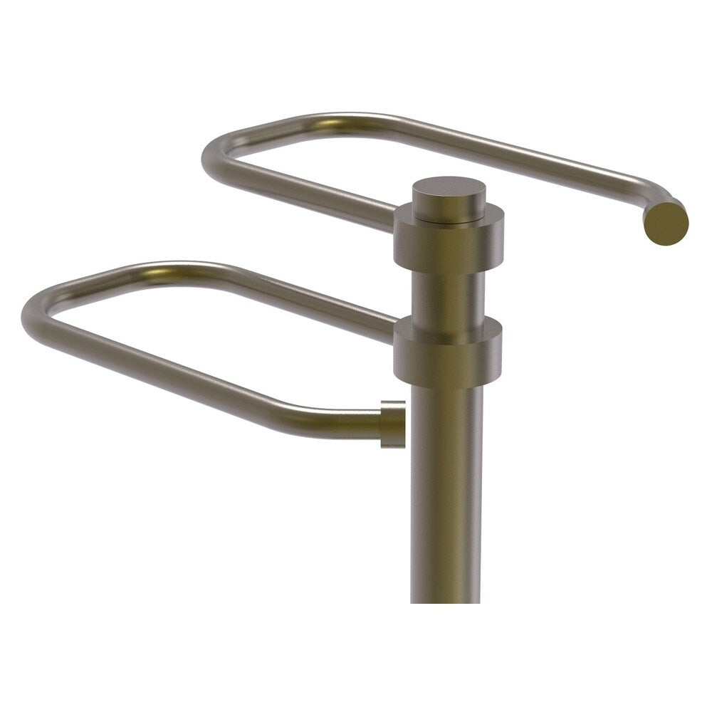This freestanding towel rack by Allied Brass features a weighted round base and two bars sized perfectly for hand towels and washcloths. Crafted from solid brass in a rich antique brass finish, it blends contemporary lines with classic detailing for a refined bathroom accent.