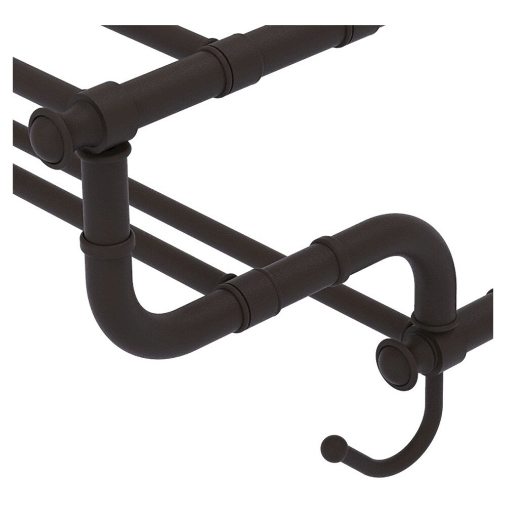 A space-savvy wall-mounted towel shelf from Allied Brass’ Carolina Collection, crafted from solid brass in a rich oil rubbed bronze finish. The integrated double towel bar adds drying capacity while the open rack stores folded towels for a tidy, upscale bath.